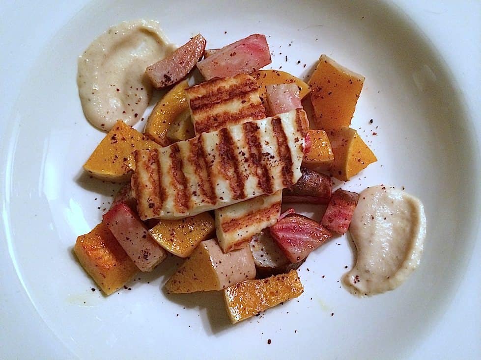 De chioggia bieten heb ik gebruikt om samen met pompoen te roosteren en die serveerde ik met gegrilde halloumi.
