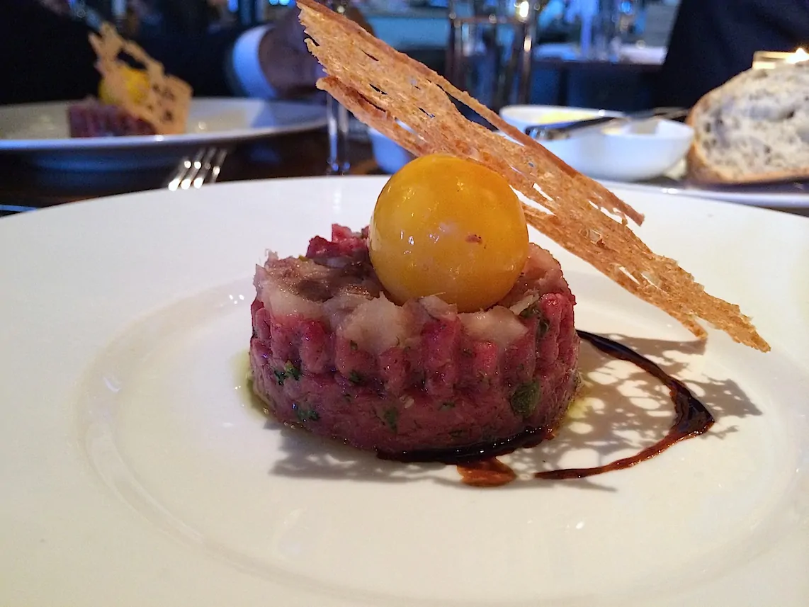 Ons voorgerecht was een prachtig mooi gerechtje van steak tartaar van Baambrugs-Gascogne rund met gegaarde eidooier en zuurdesem krokant. Hier dronken we een Lirac Chapelle de Maillac uit 2012 bij. Mijn smaakpapillen waren gelijk weer gelukkig.