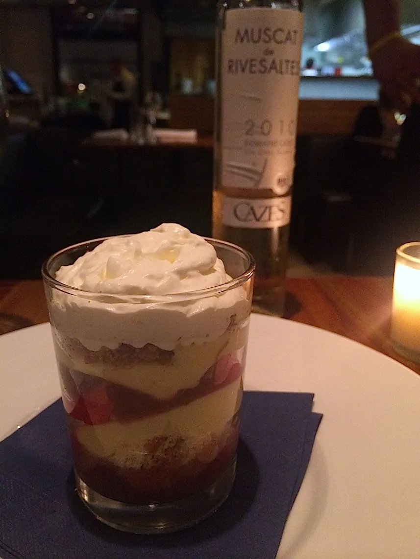Het desssert was een trifle van rabarber met vanille, custard, aardbeien, koekkruim, room en kaneel. Een lekker dessert, maar niet heel spectaculair. Vooral niet qua presentatie. Nou ben ik wellicht wat verwend, maar een dergelijke trifle maak ik thuis ook heel makkelijk. In een restaurant verwacht ik dan net iets meer. De muscat als dessertwijn was er ongelukkig bij gekozen, maakte het geheel veel te zoet.