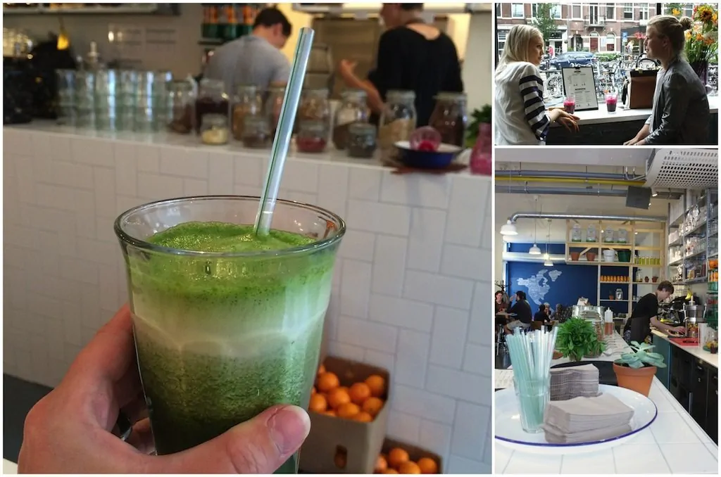 Ik nam de proef op de som bij de vestiging in de Eerste Constantijn Huygenstraat en bestelde eerst maar een ‘juice’. Een schot in de roos, want deze ‘North American’ met spinazie, appel, ananas en limoen (klein € 3,95/groot € 6,25) was overheerlijk. Een goede balans tussen groente en fruit en heerlijk romig. Binnen no time was mijn glas leeg.