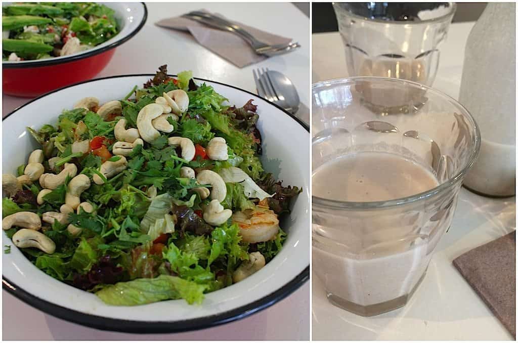 Door naar de ‘salad’, want ik wil natuurlijk alles proeven van wat mij wordt beloofd in de naam. Ik kies voor een grote ‘Oriental’ met groen-rode sla, veldsla, gamba, rode paprika, sugar snaps, lente ui, cashewnoten, verse koriander, zoet-zure vinaigrette en bruine rijst (klein zonder rijst € 6,25/groot met rijst € 9,95) en drink daar een geweldig smakende verse notenmelk bij. Bij het serveren valt me gelijk op dat niet alles in mijn bakje (zeg maar gerust: bak) zit. Zo mis ik onder andere de sugar snaps. Eerst maar eens een hap…wauw wat een smaak! Je proeft de versheid en de pure smaken van alle ingrediënten en de zoet-zure vinaigrette is geweldig. Ik vergeet al snel dat ik dingen mis, maar vraag later toch nog maar even aan een van de heren hoe dat zit. Het antwoord is niet alleen duidelijk, maar ook heel logisch. Dagelijks krijgen ze verse aanvoer van hun eigen boerderij en collega-boerderijen in de omgeving. Wat er die dag niet voorradig is, wordt ook niet geleverd. Dat maken ze vervolgens weer goed door wat extra’s van andere ingredienten toe te voegen zodat alles ook wordt opgemaakt. Logisch, zo heb je geen waste en worden er geen onnodig dure ingrediënten ingekocht die niet in het seizoen horen. Ik vergeef het ze direct, maar zou er wel een regeltje aan wijden op de menukaart. Geen beter bewijs van je ‘made by farmers’ belofte die op de kaart staat.