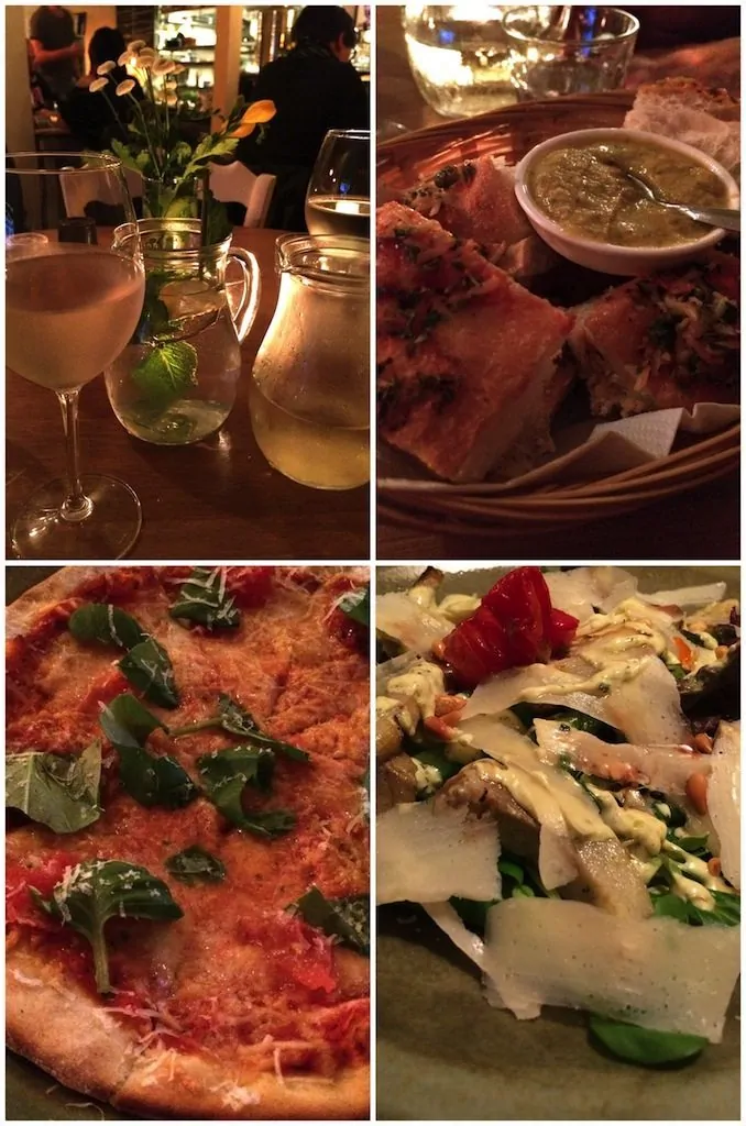 Onze avond begint met een karafje witte wijn en zelfgebakken brood met kikkererwten spread. Er wordt ook spontaan een karafje met water, citroen en munt op tafel gezet. Dat vinden we nou fijn. Dat brood is trouwens te gek, ik moest me beheersen om niet het hele mandje leeg te eten. Of heb ik dat wel gedaan? Ik weet het niet meer zo goed ;-).