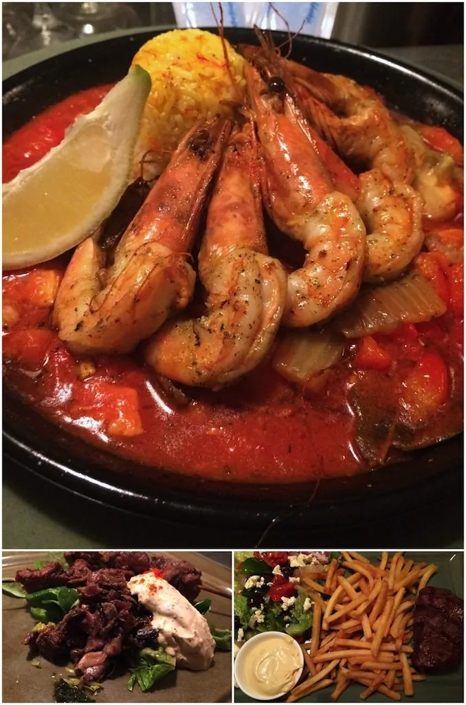 Dan het hoofdgerecht, oh oh het hoofdgerecht…eerst maar even zeggen dat Tinus een perfecte black angus steak van de grill krijgt. Mooi rosé, frietjes, salade en huisgemaakte mayonaise erbij voor € 18,50. En toen! Mijn casserole de gamba, in 1 woord WOW. Een pannetje (zeg maar gerust pan) gevuld met tomaten-visbouillon, saffraanrijst en grote wilde gamba’s. Tenminste, dat staat op de kaart. Maar in werkelijkheid zit mijn pannetje nog veel voller. Naast gamba’s vind ik ook kleine garnalen, schelpdieren en witvis. Er komt geen einde aan en de smaak is perfect. Alsof ik met mijn voeten in het zand aan de zee zit te eten. En dat alles voor € 18,75. Hulde.