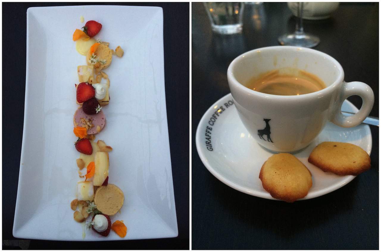 Het dessert is een kunstwerk waar veel bereidingstechnieken zijn gecombineerd op 1 bord. Waaronder verse bosperzik en crème van bosperzik, verse aardbeien, aardbeienmousse en mousse van geitenkaas, huisgemaakte aardbeienjam en gel van jam, noten en eetbare bloemen. Een mooi gerechtje, maar wel wat veel technieken bij elkaar waardoor je niet alles kunt onderscheiden als je aan het eten bent. Op een gegeven moment ben ik daar ook maar mee opgehouden, genieten vind ik belangrijker en dat deed ik.