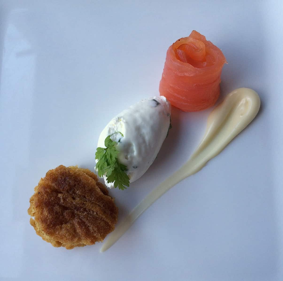 Niet veel later werd ons deze heerlijke amuse bestaande uit een blini met zalm en bieslookcrème voorgeschoteld. Dit mondvermaakje stond niet op het Iens menu en was een verrassing van Spijs. Zo fijn als restaurants net dat beetje extra doen, wij voelden ons direct gewaardeerd als gast.