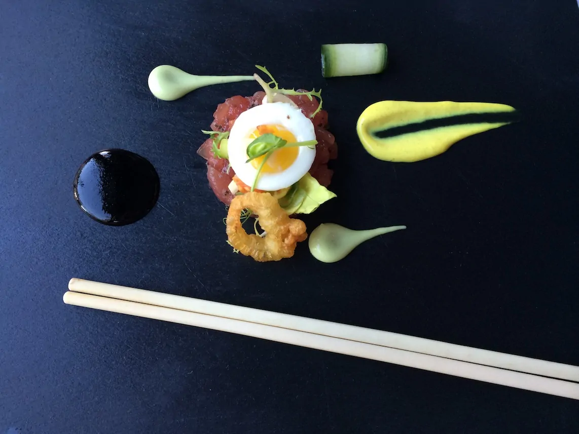 Het eerste gerechtje van het menu was deze tartaar van tonijn, kerrie kokos mayonaise, kwarteleitje, wasabimayonaise en een reductie van sojasaus. Mijn vriend is een ‘tonijnmonster’, anders kan ik het niet omschrijven. Hij heeft dan ook bij elke hap laten horen hoe goed dit hem smaakte. En ik moet hem gelijk geven, de kwaliteit van de tonijn was uitmuntend en met het kwarteleitje, de wasabimayo en soja was het geweldig. Het enige wat van mij weggelaten had mogen worden is de kerrie kokos mayonaise. Ongetwijfeld heerlijk in een andere combinatie, maar de smaak ervan was te sterk waardoor je de tonijn niet proeft en dat vind ik zonde. Gelukkig wordt het apart geserveerd en is er dus geen man overboord.