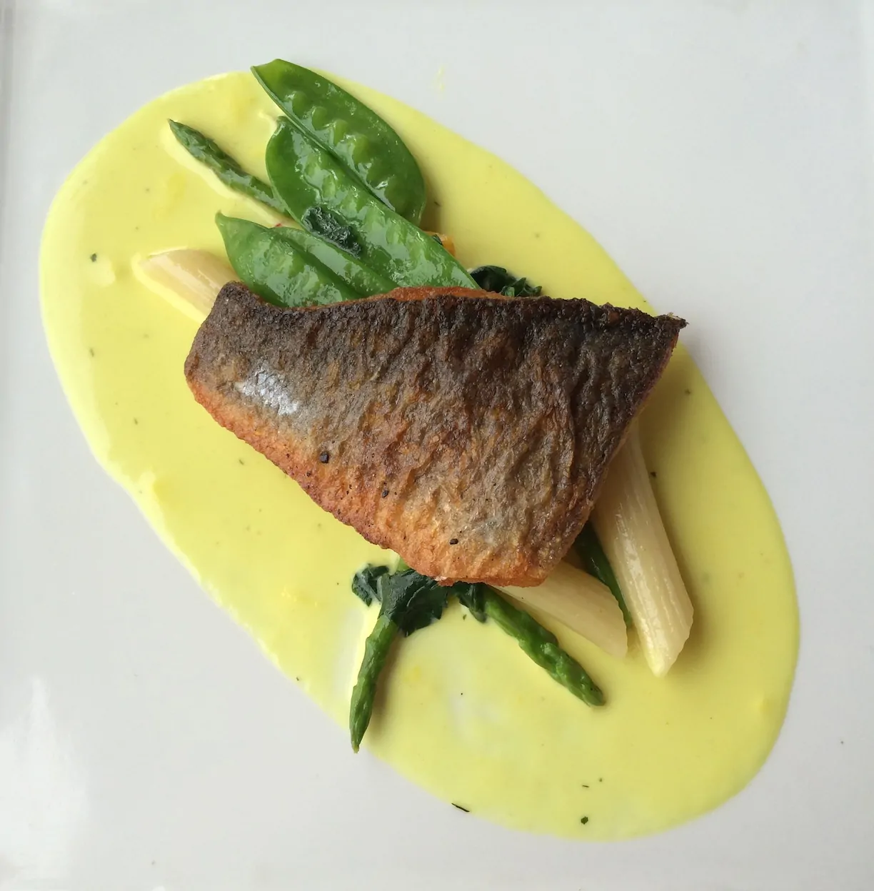 Deze perfect op de huid gebakken zeebaars met penne, wilde spinazie en bospeen was mijn favoriete gang. De saffraan-beurre blanc was perfect en alle smaken bij elkaar zijn om je vingers bij af te likken.