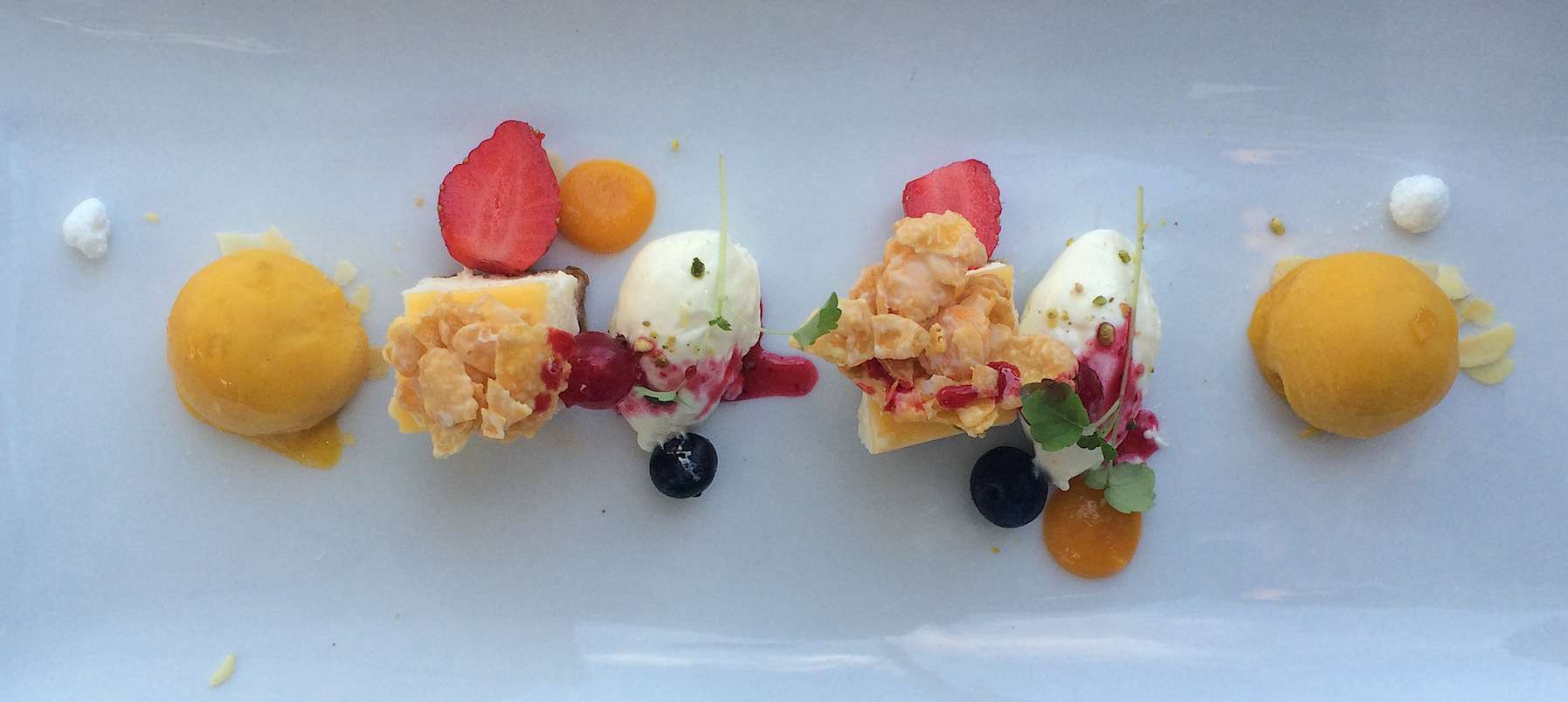 Na het hoofdgerecht besloten wij buiten van het dessert te genieten met daarbij een heerlijk glaasje Portugese dessertwijn, alweer een schot in de roos. Het dessert bestond uit cheesecake, witte chocoladecrème met fruit, maracujaijs en een gelei van mango. De perfecte laatste gang van ons menu, waarvan we hebben gesmuld en Chris me probeerde over te halen om nog wat aan hem af te staan. Echt niet!