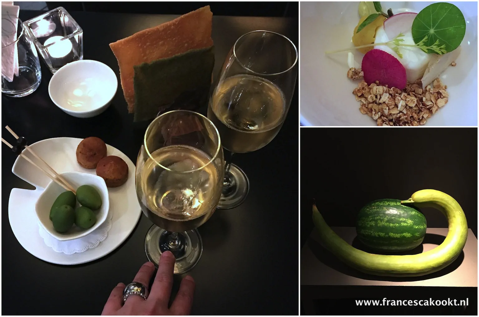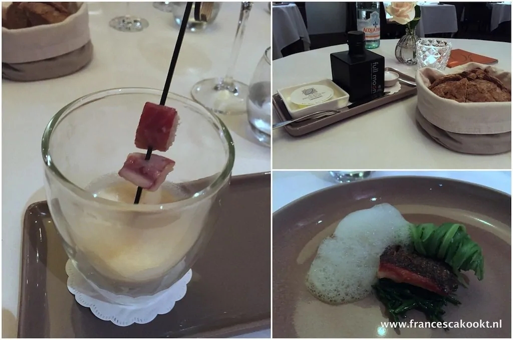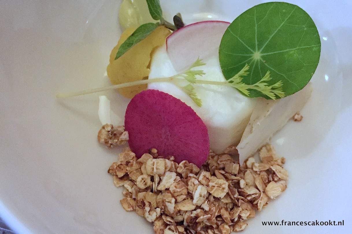 Na een glas champagne met bites en een geweldige amuse van bavarois van geit met basilicumcrème, radijs en gekarameliseerde haver in de lounge is het tijd om aan tafel te gaan. Ik loop langs het meest intrigerende groenten stilleven wat ik ooit heb gezien en wandel het intieme restaurant binnen. De kunst aan de muren valt me direct op. Die komt prachtig tot zijn recht in de serene ruimte. Stiekem ben ik ook nog even gaan kijken in de tuin. Daar vermaak je je wel bij mooi weer, ziet er zeer sfeervol uit.
