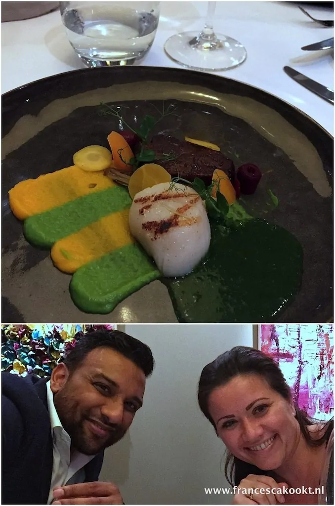 Over de coquille & kalfswang met witlof, wortel en doperwt ben ik wat in verwarring. Het was zoveel op 1 bord. De coquille vocht om aandacht met de kalfswang. Alleen de coquille in combinatie met de wortel en doperwt is al een zalige combinatie. Ach, wellicht ben ik niet zo’n waaghals, want mijn tafelgenoot eet gretig zijn bord leeg. Onze sommelier schenkt er een glas Kreeftenwijn van Joseph Puig bij. We maken nog even een selfie tussendoor voor de peuter die bij oma thuis bijna naar bed gaat, dat hoort er tegenwoordig gewoon bij.