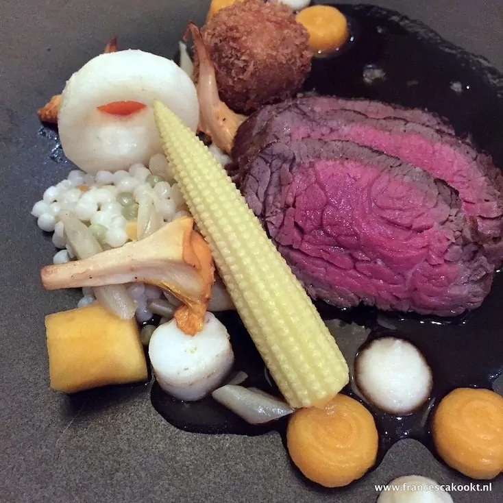 Het hoofdgerecht, ik word er stil van. Boterzachte diamanthaas, perfect rosé gebakken. Met pompoen, paddenstoel, gort, sjalottenjus, een bitterbal en een glas Quinta das Tapias (mencía/tempranillo). Wat een gerecht!