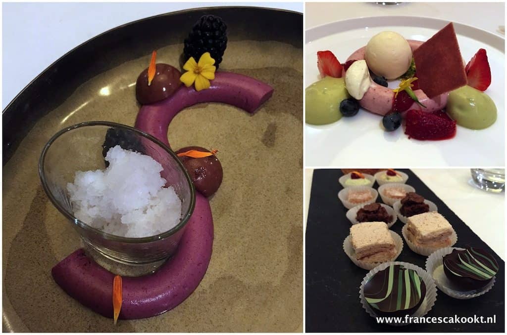 Bij het eerste dessert staat de braam in de hoofdrol, gecombineerd met een heerlijke vlierbloesem granita. Ik ben fan. Helaas krijg ik bij het tweede dessert wat déjà vu gevoelens. Wederom met rood fruit en dezelfde textuur van de mousse. Deze had van mij meer een contrast mogen zijn, maar dat is heel persoonlijk. Verder was de smaak zeer goed.