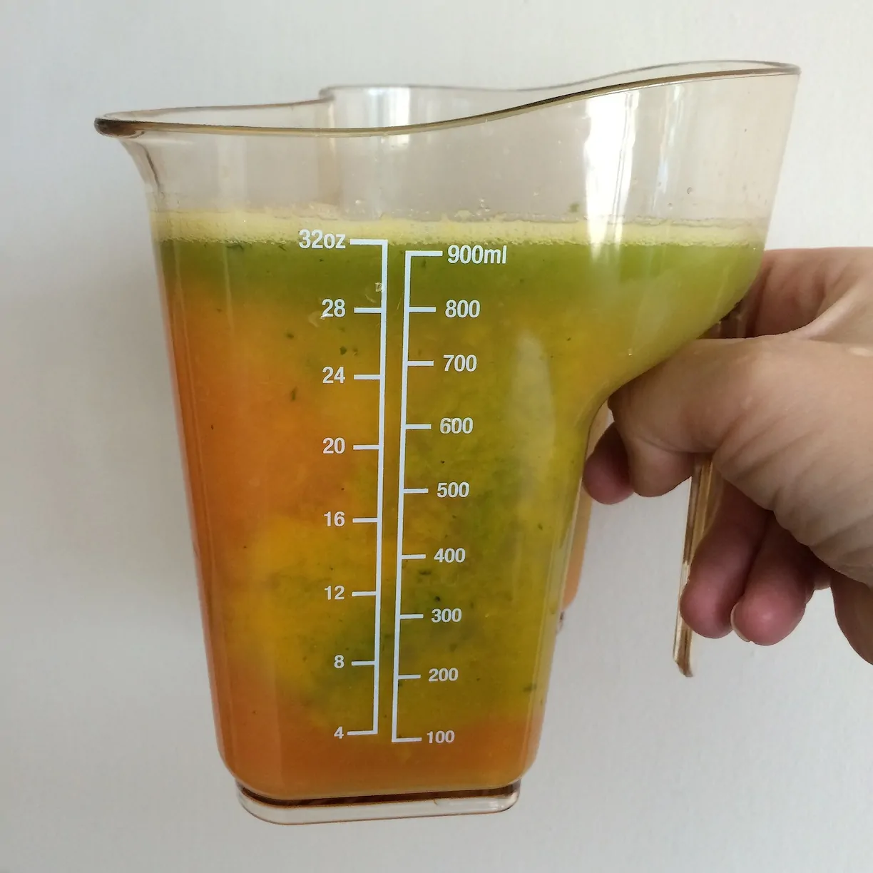 Inmiddels was de appelsap klaar en ik schonk het in een glas. Hey, wat een verrassing: het heeft bijna dezelfde kleur als de appelsap van de boer. En jawel, de peuter drinkt het! Hij vindt het ook nog lekker. Diezelfde middag ga ik aan de slag met andere sapjes en maak ook gelijk wat voor de volgende dag. Het schoonmaken is meer een klus dan bij een sapcentrifuge. Je moet wel even in de weer met een borsteltje onder stromend water.