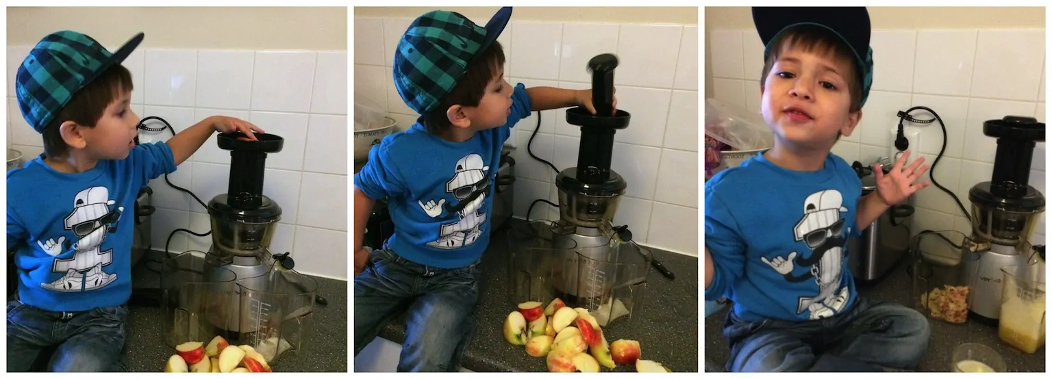Ik begon maar eens met een appelsapje, het favoriete drankje van de peuter. Appelsap in pakjes kopen we thuis niet dus hij krijgt of de biologische variant van de boer of we maken zelf appelsap. Alleen, de appelsap uit de sapcentrifuge kreeg ik er nooit in bij hem. Dit had alles te maken met het snel oxideren waardoor de appelsap een bruine kleur kreeg. Als ik zo’n bruin glas appelsap voor zijn neus neerzette, was het al snel afgelopen met de pret. Ik was dus heel benieuwd of hij wel de appelsap uit de Versapers wou drinken. Ik zette ‘m op het aanrecht en hij mocht zelf de stukken appel in de opening doen. Dat is natuurlijk al dikke pret voor een peuter.