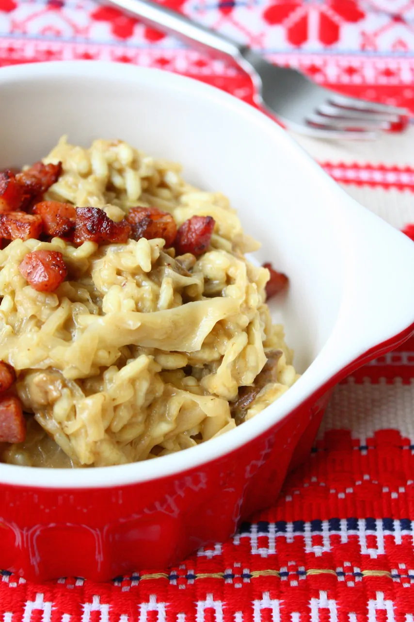 Vandaag deel ik met jullie het laatste recept uit de risotto maestro wedstrijd. Jeroen stuurde een recept in met een flinke Hollandse knipoog. Namelijk een risotto met zuurkool en porcini. Ik voegde daar nog wat uitgebakken spekjes aan toe en zo zaten we opeens een typisch Hollands recept met risotto te eten. En dat was een hele aangename verrassing, niet voor niets won hij de derde prijs in de wedstrijd.