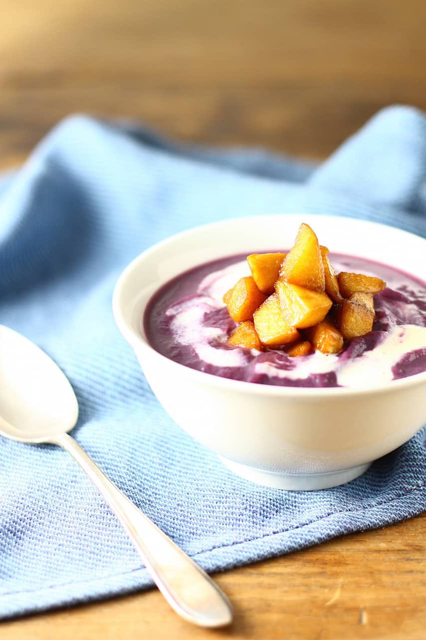 Zodra de kool gaar is ga je de soep pureren met een staafmixer. Als de soep te dik is geworden kun je nog een beetje aanlengen met kokend water. Maak ‘m niet te dun, het is lekker als het nog iets dikkig is.