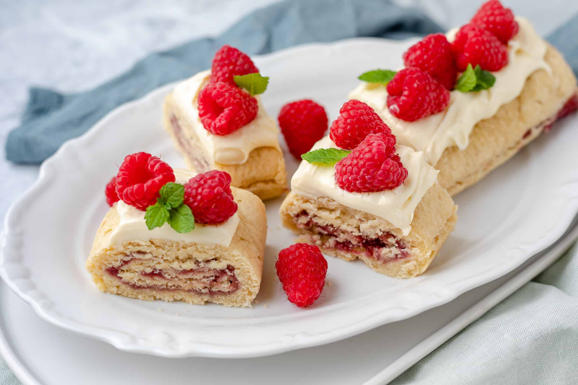 - De roomkaastopping en frambozen kun je er los bij serveren of je laat de roly poly helemaal afkoelen en daarna garneer je de bovenkant met de topping, verse frambozen en optioneel wat blaadjes munt. Snijd in plakken en serveer.