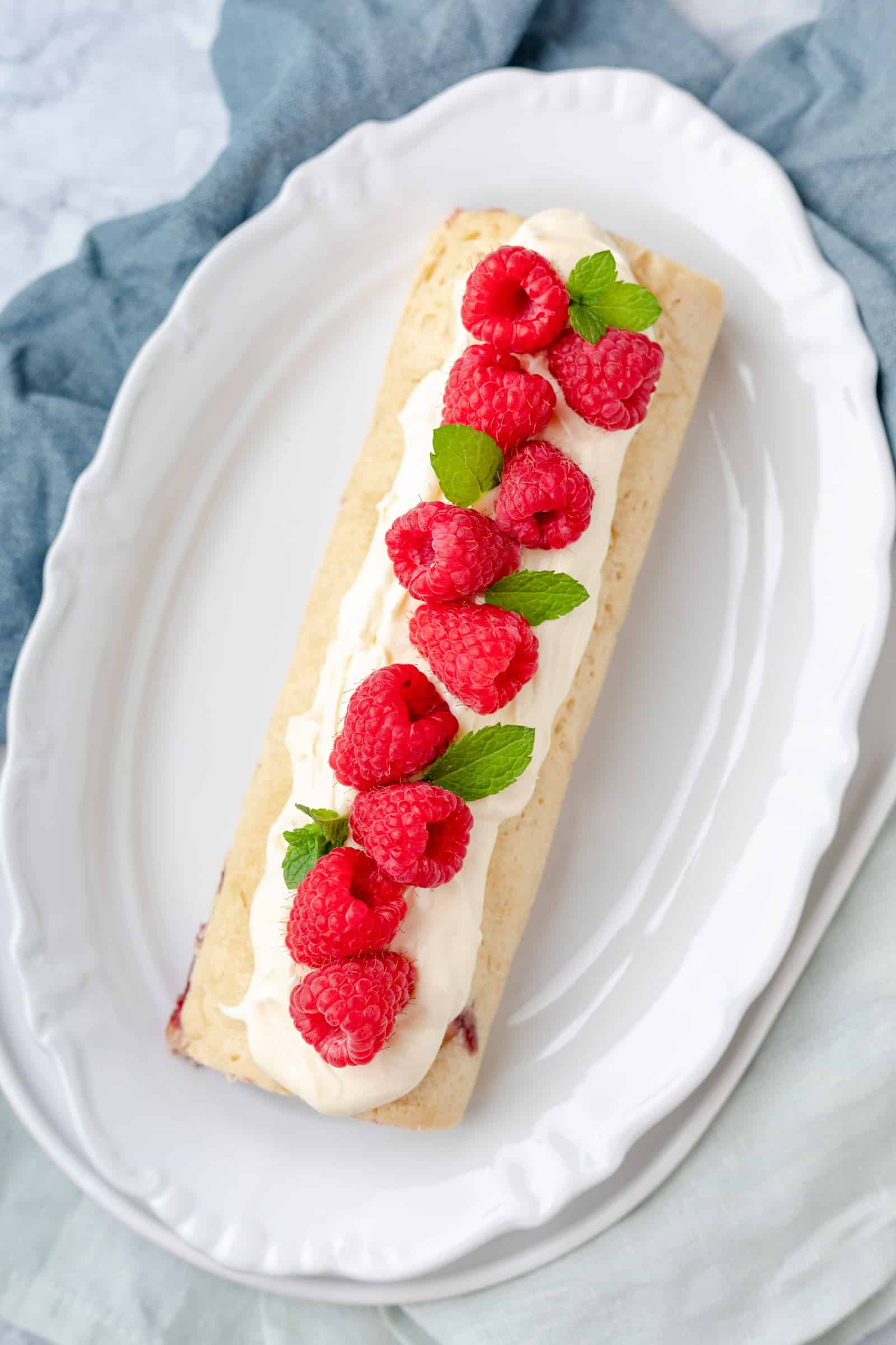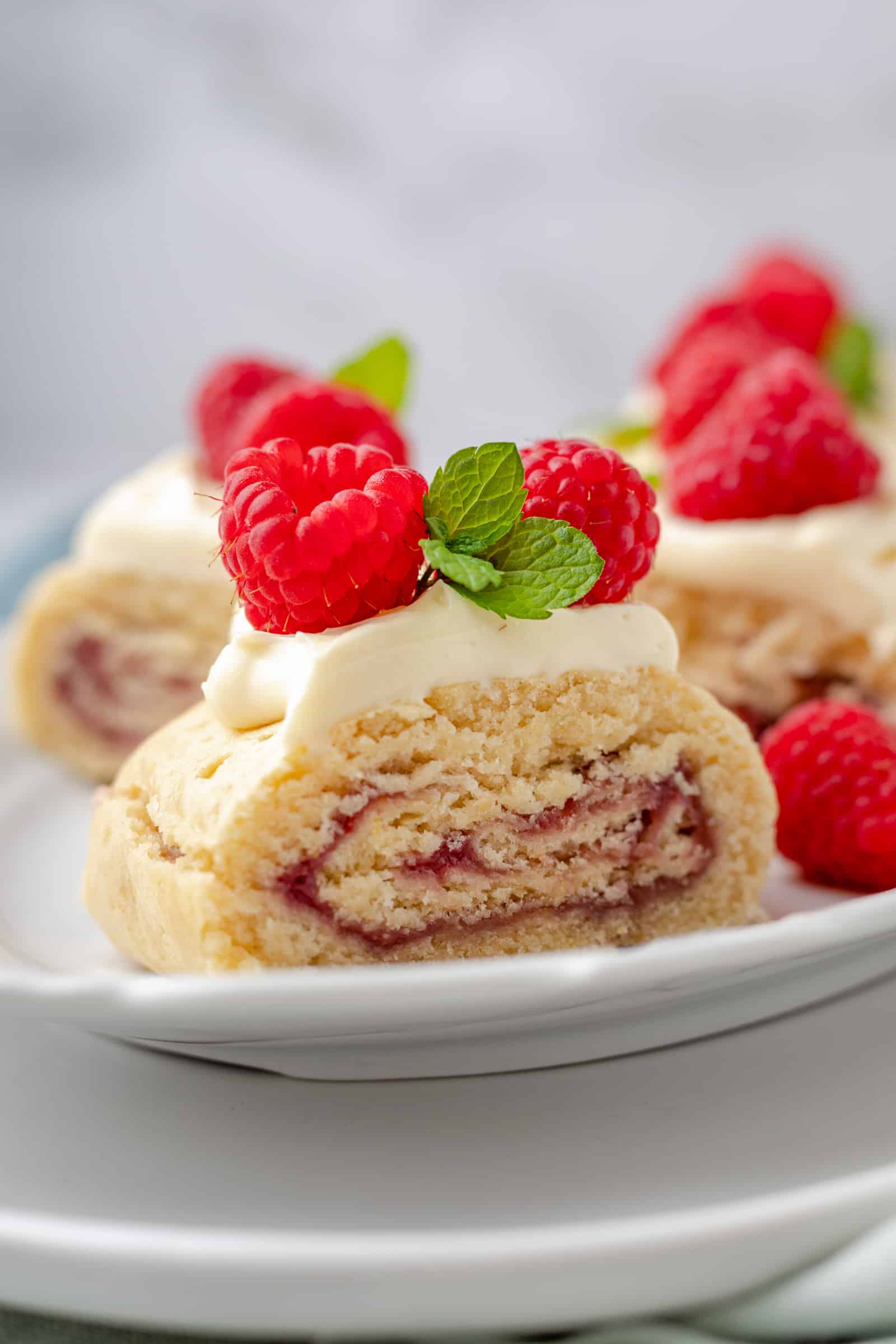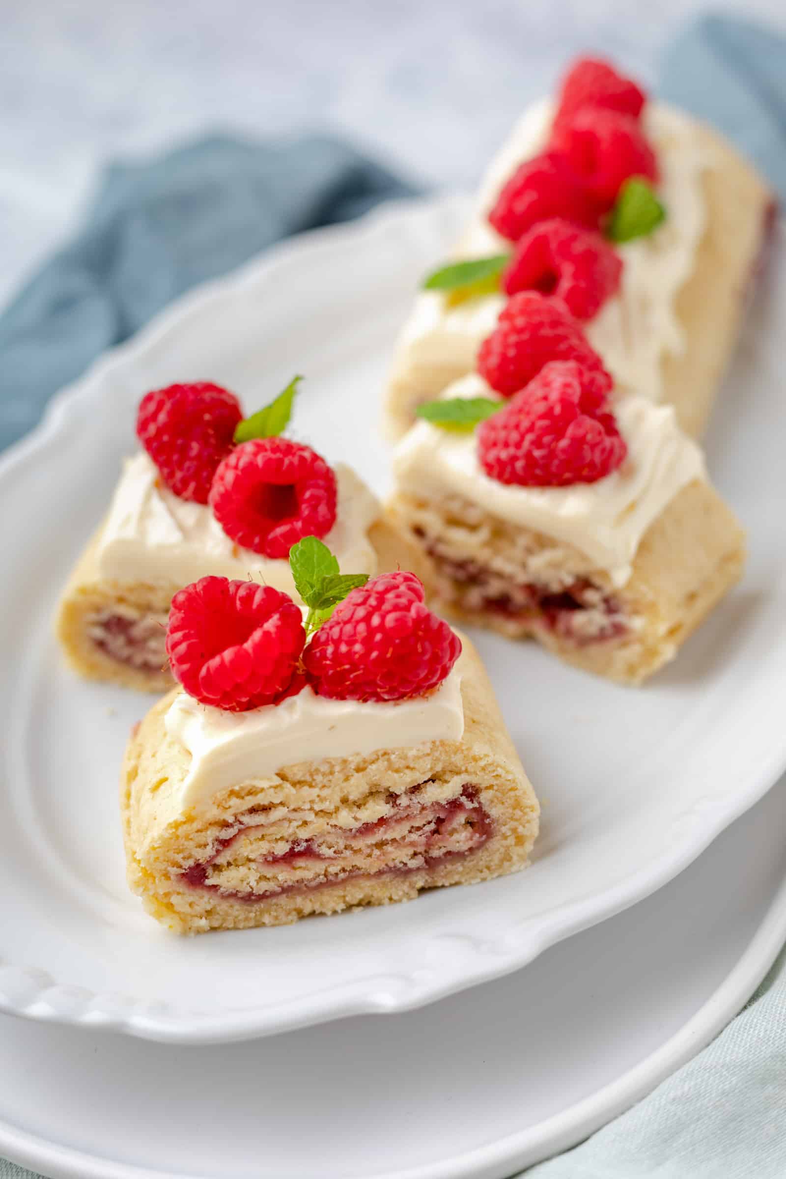 - De roomkaastopping en frambozen kun je er los bij serveren of je laat de roly poly helemaal afkoelen en daarna garneer je de bovenkant met de topping, verse frambozen en optioneel wat blaadjes munt. Snijd in plakken en serveer.