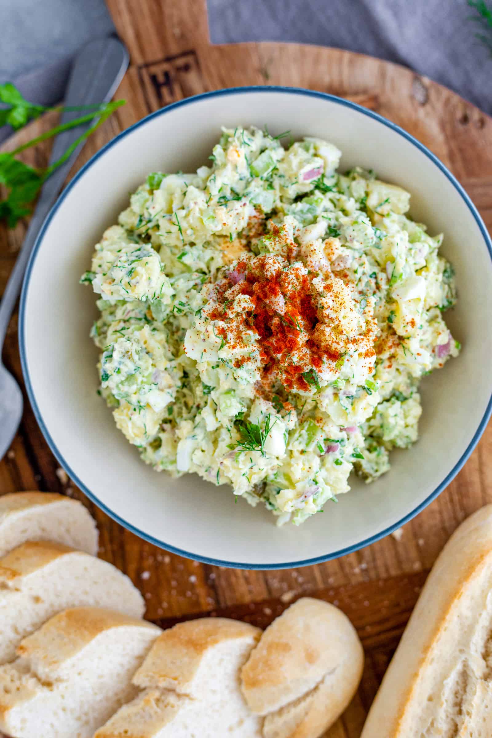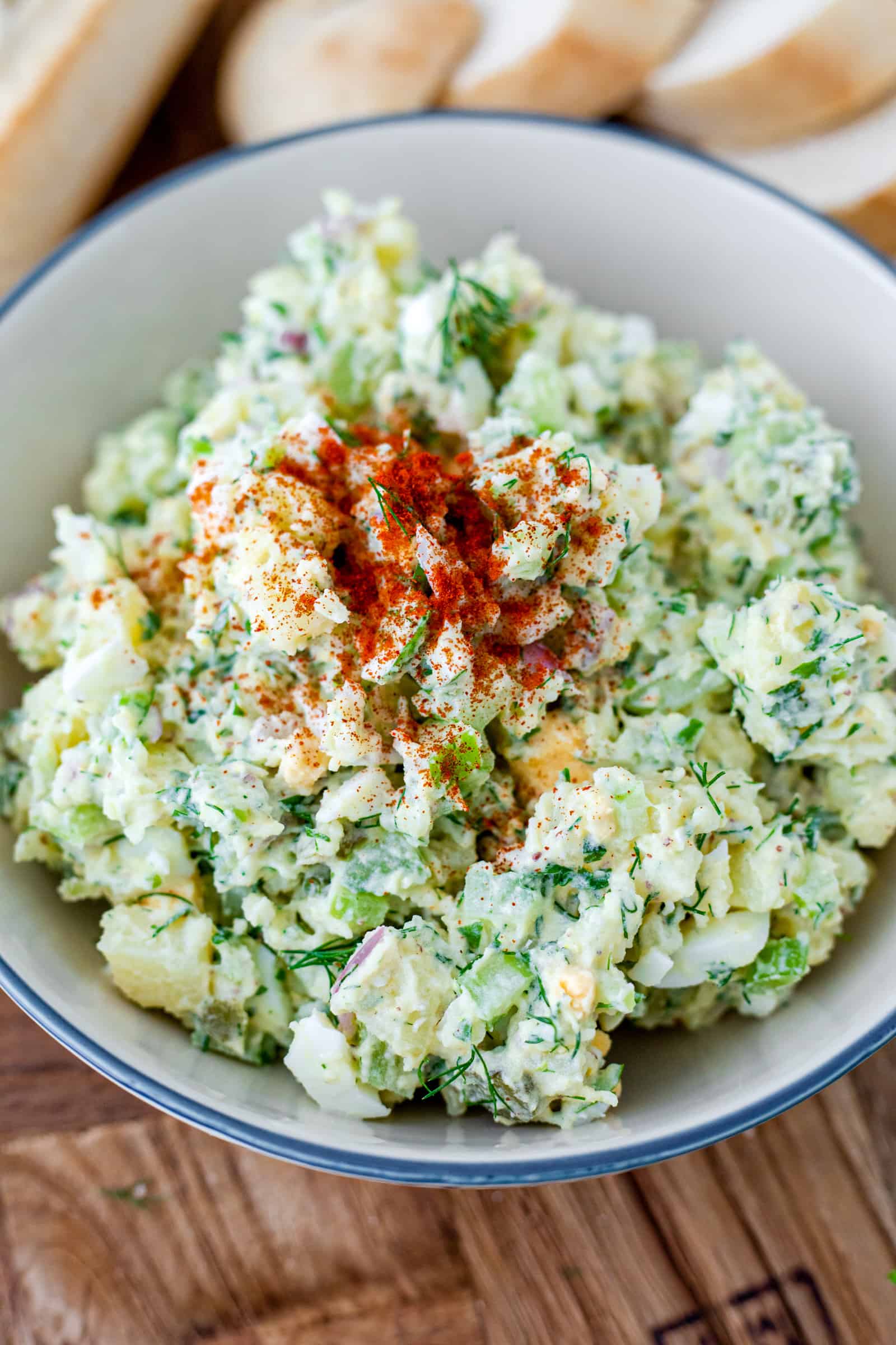 Niets lekkerder dan een romige aardappelsalade als bijgerecht bij een barbecue of als een van de gerechten op een mooie brunchtafel. Met aardappels kun je echt alle kanten op. Je kunt je aardappelsalade simpel houden of je maakt er deze luxe, romige variant van. Onder andere op smaak gebracht met sjalot, ei, bleekselderij, augurk, verse kruiden zoals dille en peterselie en als finishing touch een snufje paprikapoeder.