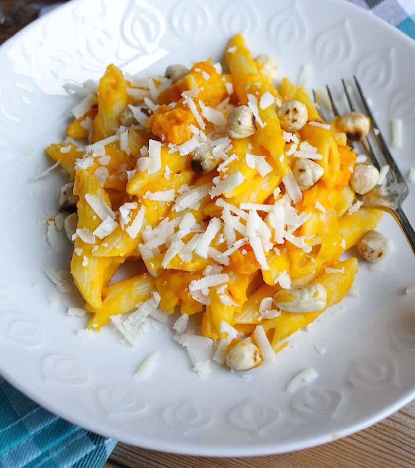 Ik vond het weer eens tijd worden voor een herfstige pasta met pompoen en flink veel room. Daar ben ik dol op. Sterker nog, daar mag je me voor wakker maken in dit seizoen.