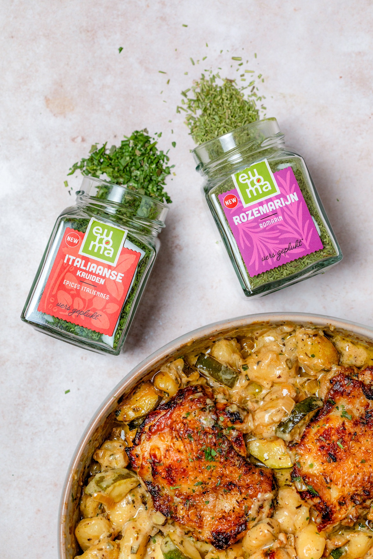 Als er iets goed samengaat voor een marinade, is het wel verse knoflook, geurige rozemarijn en olijfolie. Die combinatie maak ik dan ook regelmatig en verse kruiden heb je daar niet eens voor nodig. Met een potje Euroma Rozemarijn in huis krijg je exact dezelfde beleving, want deze kruiden zijn gevriesdroogd. Dat betekent: zo puur en geurig als vers geplukt. Meng ze met olie of water en de geur en smaak komen gewoon weer tot leven. Precies wat je wilt in bijvoorbeeld je marinade, kruidenboter of saus. Voor deze romige gnocchi heb ik ook de Euroma Italiaanse kruiden gebruikt voor nog meer smaak en die gaat fantastisch samen met de courgette en citroen.