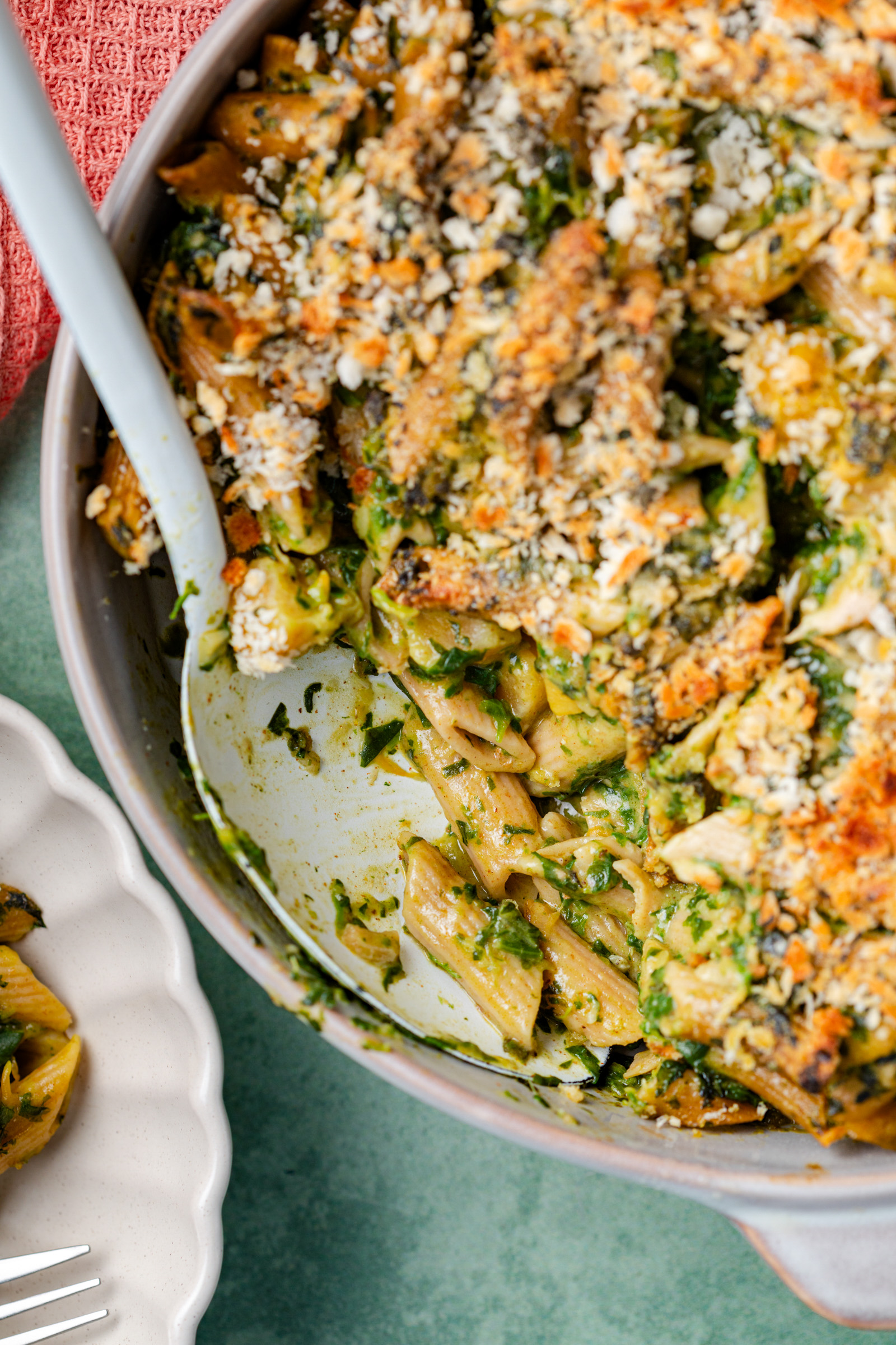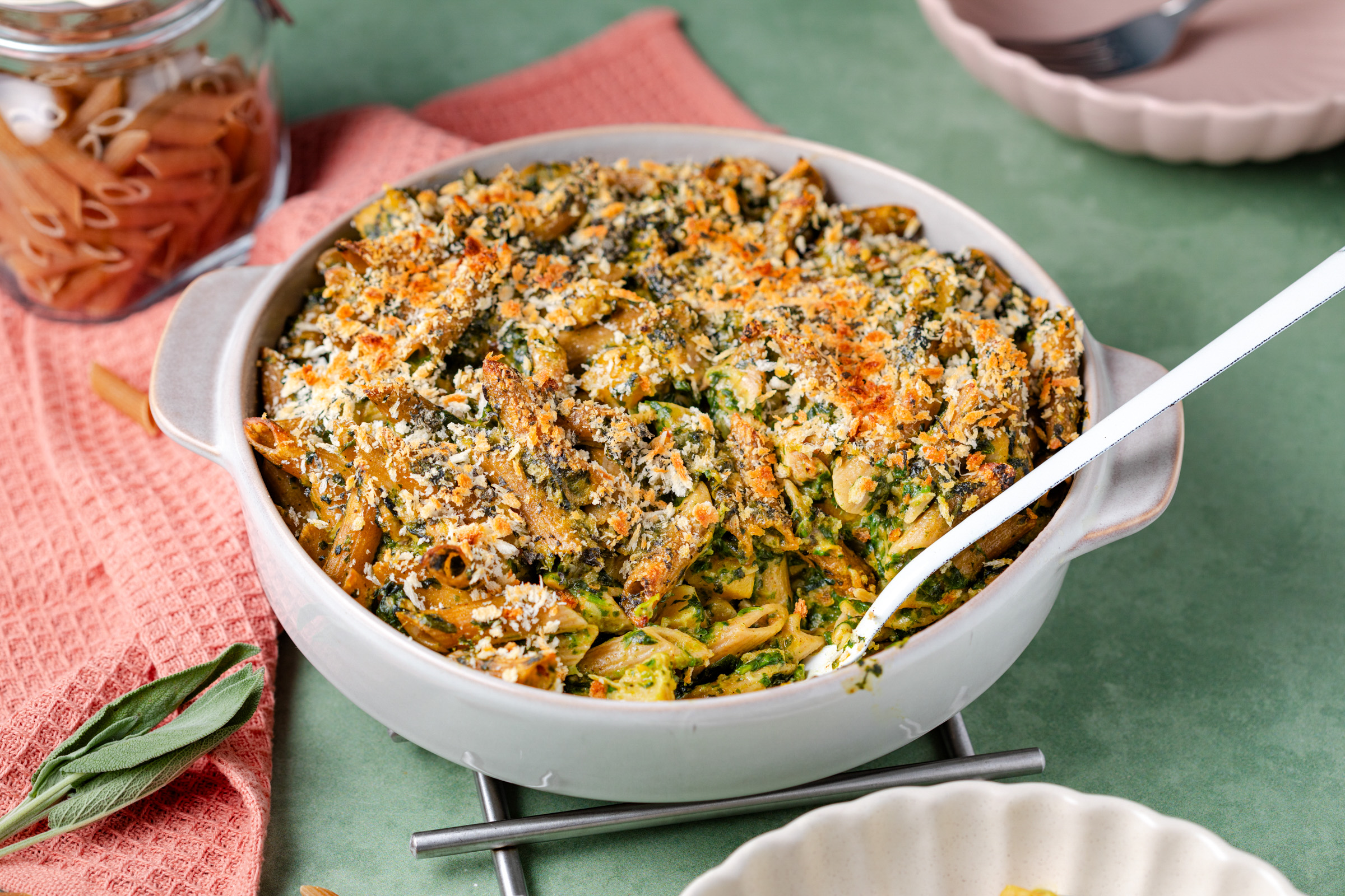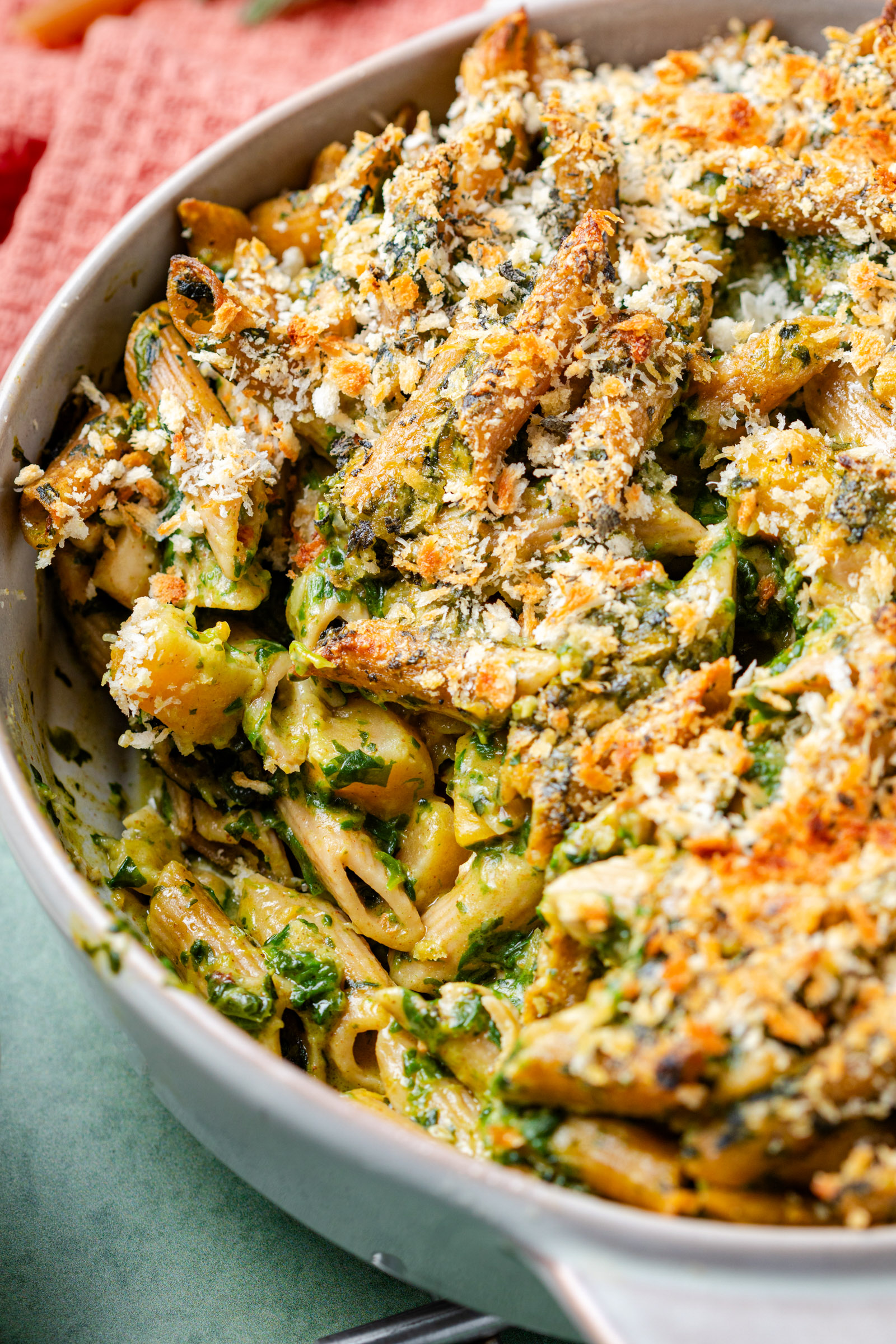 Ik gebruik hiervoor de diepvriesspinazie van Iglo en uit dezelfde vriezer plukte ik ook de pompoenblokjes. Je kunt alle groenten bevroren in de pan doen en je hoeft niets te snijden, als dat niet makkelijk is. Om extra vezels toe te voegen gebruik ik volkoren penne en ik maak een bechamelsaus van volkoren meel. Met een dakje van panko gaat de romige ovenschotel de oven in om er vervolgens lekker knapperig weer uit te komen. Eet smakelijk!