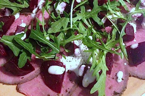Verdeel de rosbief over 4 bordjes. Verdeel daar royaal wat bietjes over en besprenkel dit met de dressing. Strooi er blaadjes rucola over en maal er wat zwarte peper over.