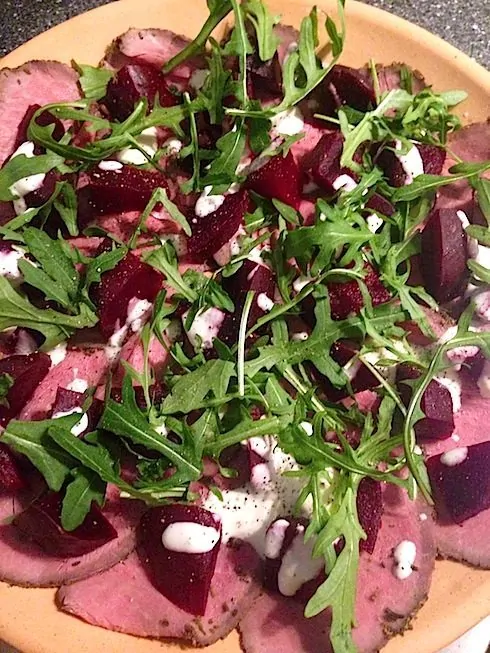 Het is een heel rijk smakende carpaccio en je kunt ‘m heel goed serveren als voorgerecht (kleine bordjes), als lunch of als lichte avondmaaltijd.