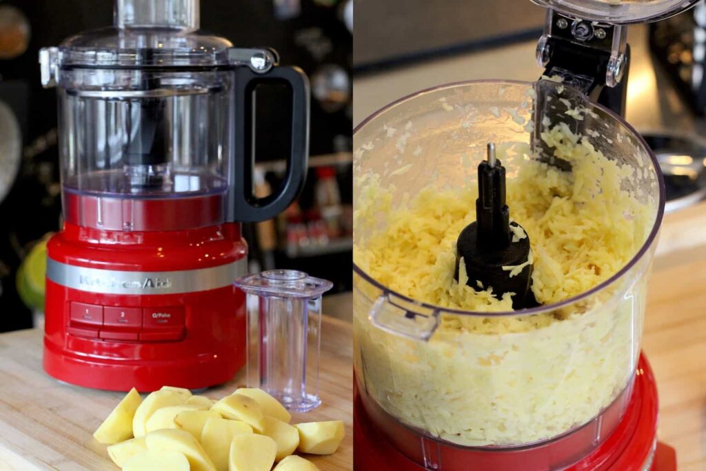 - Schil de aardappels en halveer ze in de lengte. Rasp ze daarna in sliertjes met de omkeerbare schijf om te raspen.