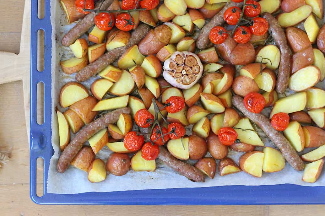 - Haal daarna uit de oven en leg de worstjes tussen de aardappels. Besprenkel de takjes cherrytomaten met een klein beetje olijfolie en verdeel over de aardappels. Zet het bakblik daarna nog circa 20 minuten in de oven. Draai de worstjes halverwege een keer om.