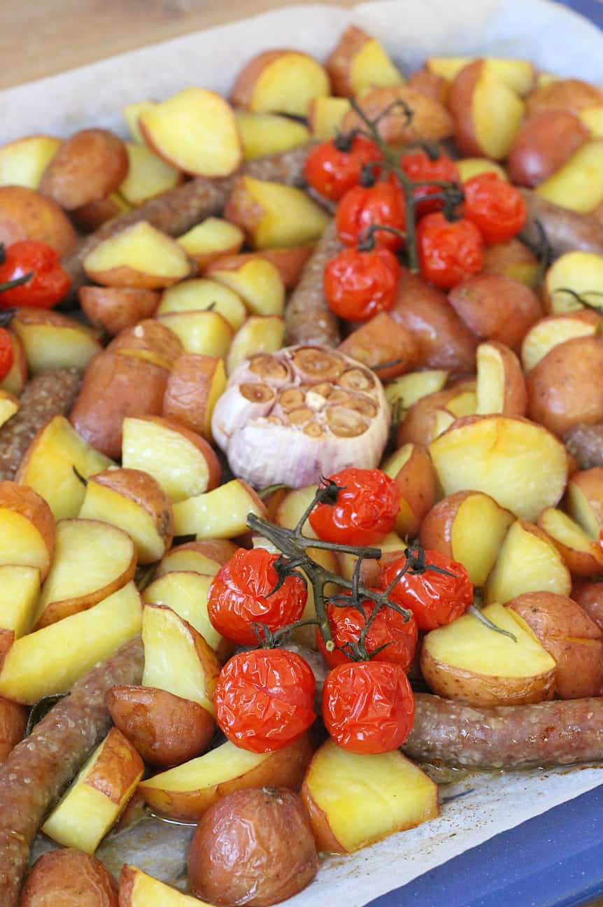 Voor mij zijn aardappels uit de oven een van de lekkerste comfort food gerechten die er zijn. Vooral als je deze combineert met rozemarijn, knoflook en worst in dit recept voor rozemarijn aardappels met worst.