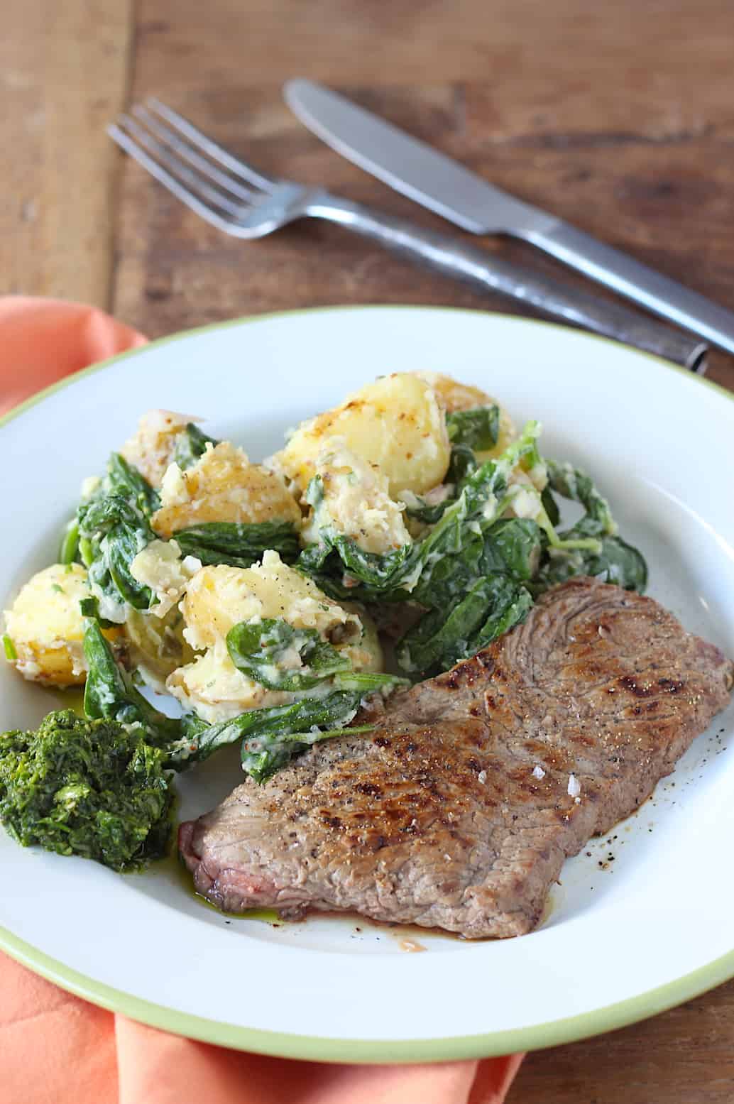 4. Serveer de filetlapjes met de groene salsa en aardappelsalade.