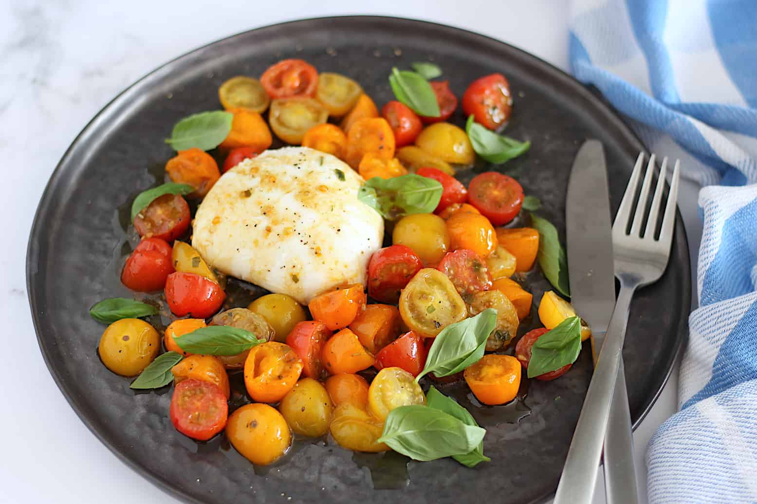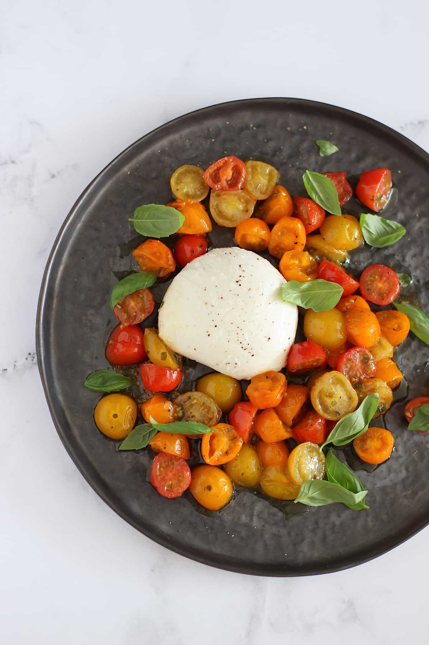 4. Leg de cherrytomaten op een schaal of verdeel over bordjes. Leg de bollen mozzarella of burrata ertussen en druppel wat vocht (niet een hele plons) van de cherrytomaten, wat in het bakblik is achtergebleven, erover. Garneer met een klein snufje zwarte peper en blaadjes basilicum. Serveer direct.