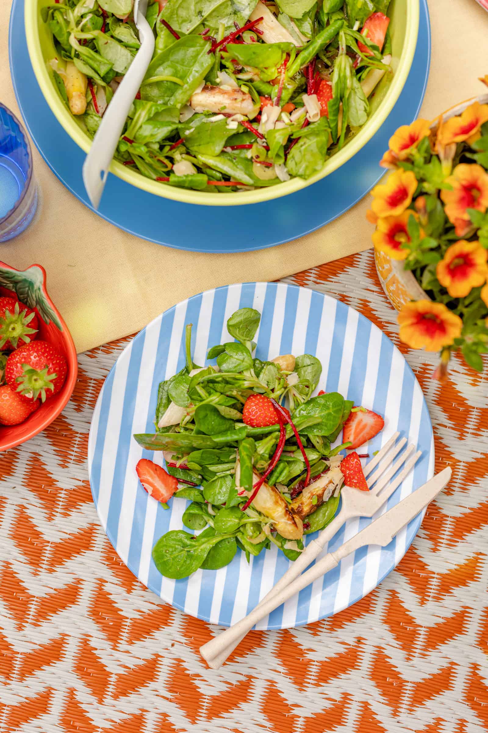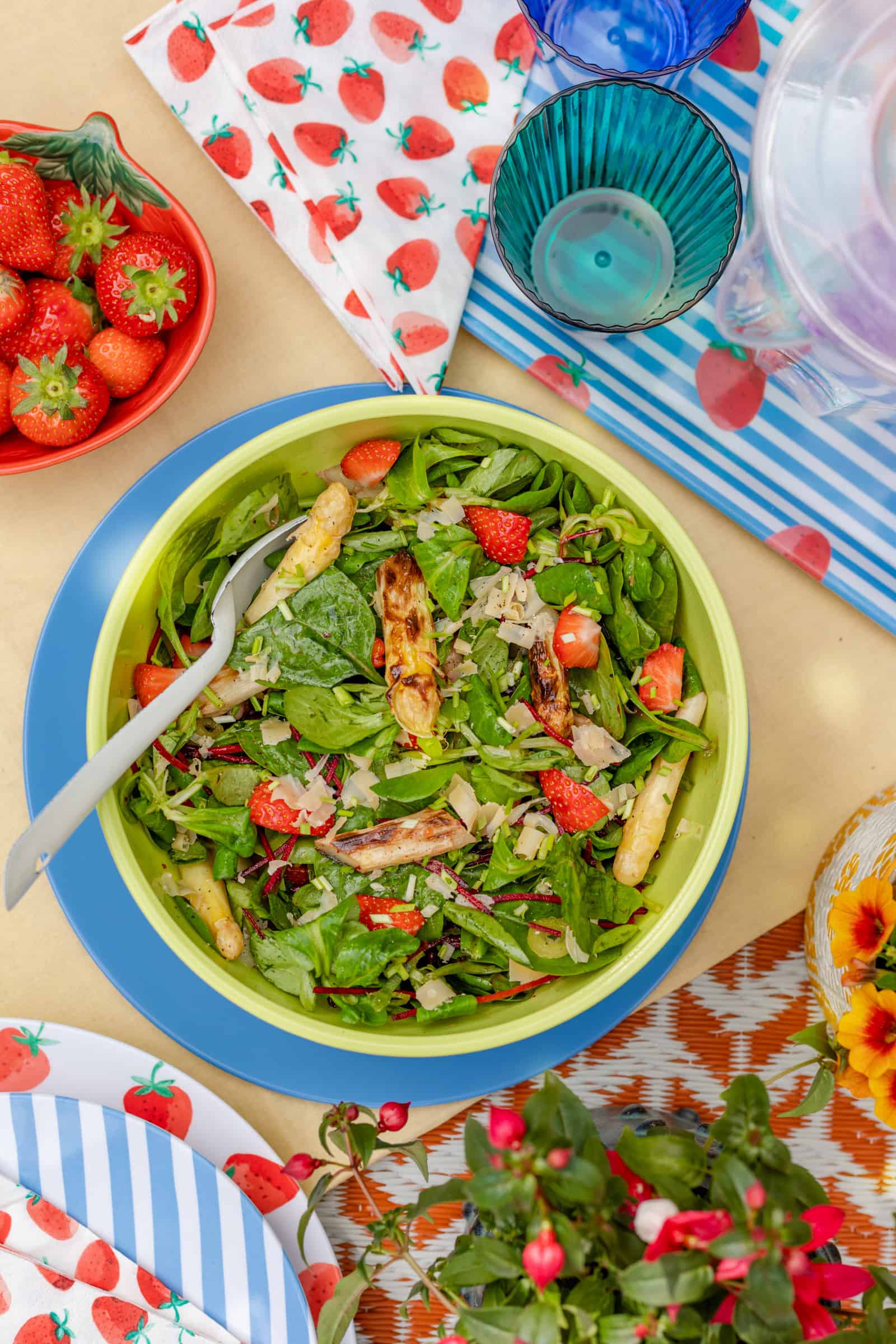 - Meng de sla met de aardbeien, asperges, oude kaas en bieslook.