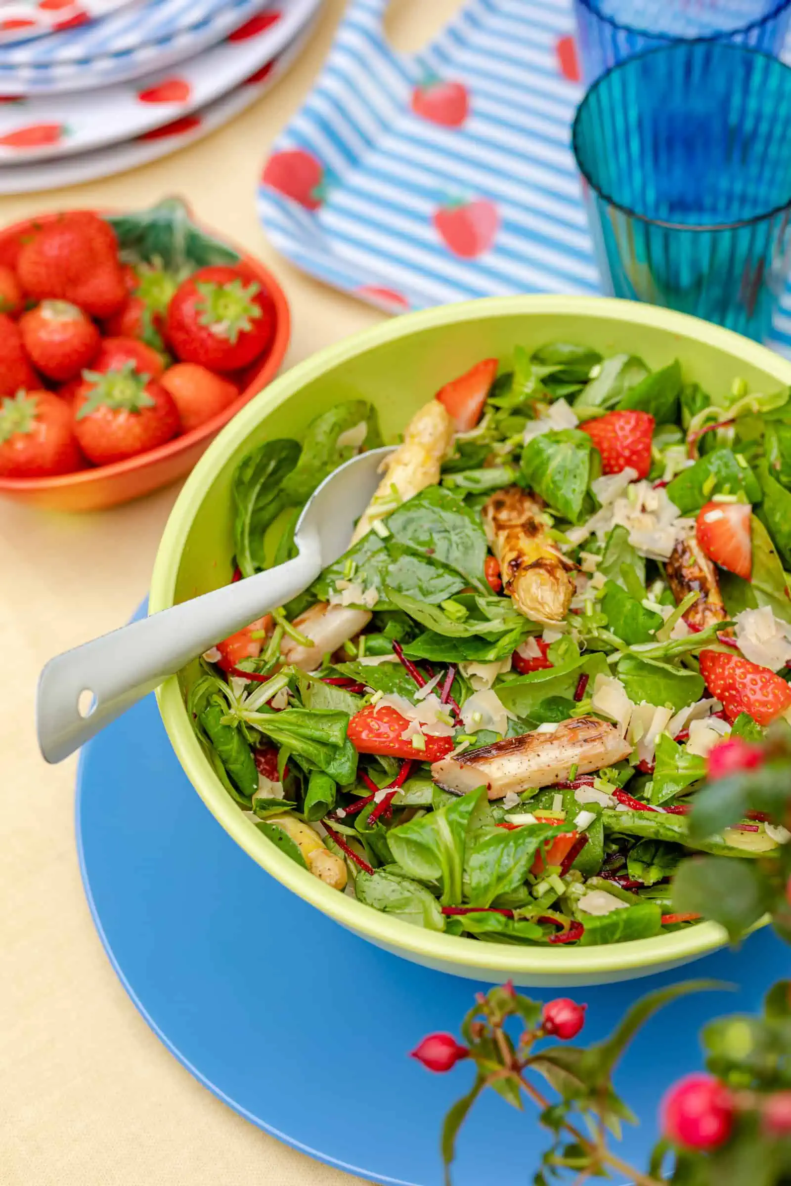 - Meng de sla met de aardbeien, asperges, oude kaas en bieslook.