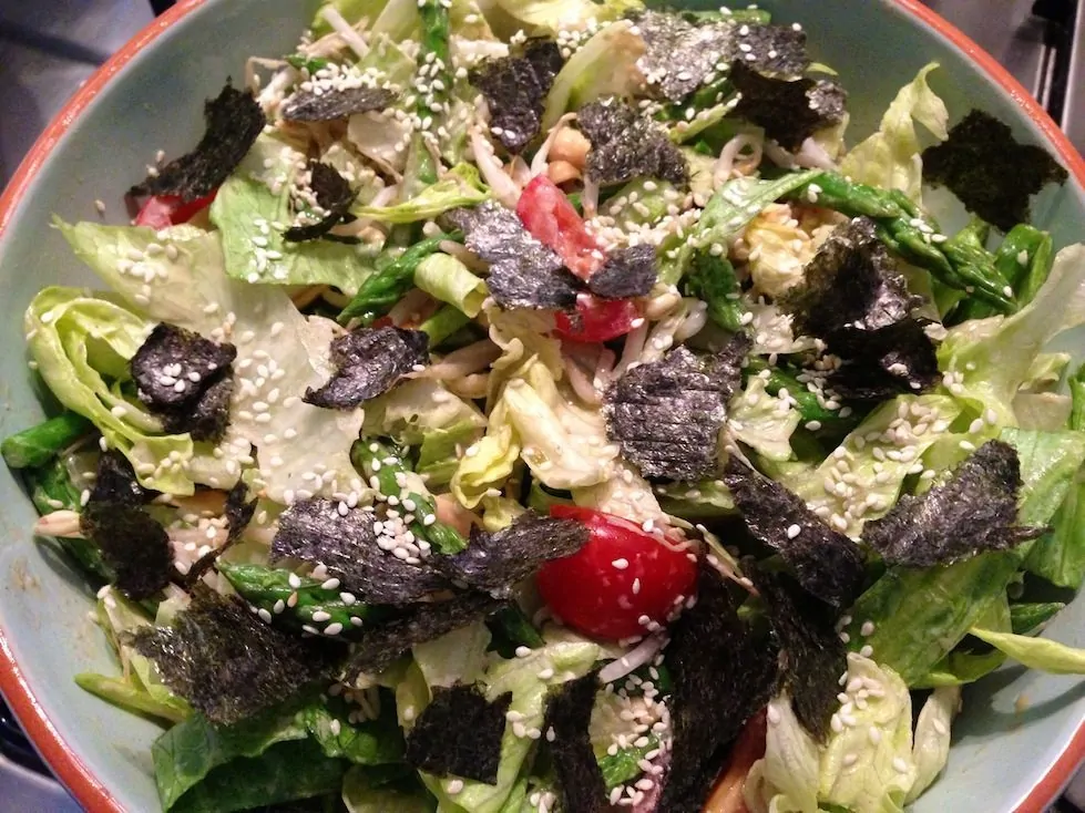 Deze salade met asperges, zeewier en wasabi dressing smaakt heerlijk als bijgerecht bij sushi of gerechten met een Japans tintje. Makkelijk om te maken, ook als vegetarische lunch voor doordeweeks als je eens wat anders wilt eten.