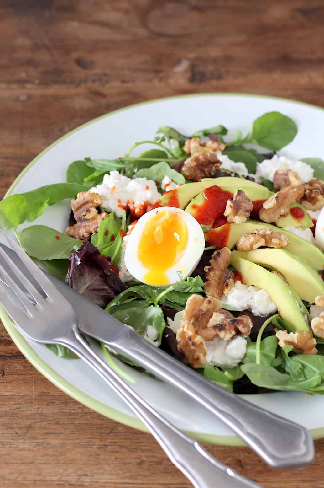 - Maak 4 borden op met bladsla, cottage cheese en avocado. Halveer de eieren en leg ze ook op het bord. Garneer met peper, zout en sriracha naar smaak. Verdeel als laatste de walnoten erover.