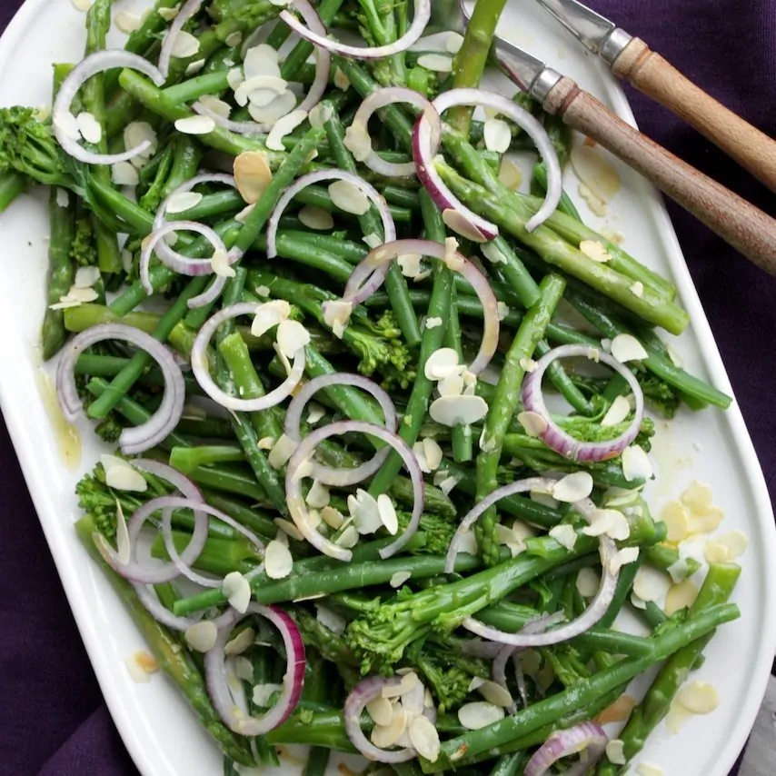 Verdeel de groenten over een schaal samen met de rode ui. Sprenkel de vinaigrette erover en garneer met het geroosterde amandelschaafsel.