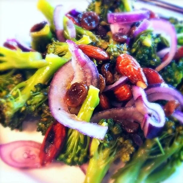 De smaken van de geroosterde amandelen en broccoli zijn heerlijk bij elkaar. De rode ui geeft een beetje pit en de rozijntjes maken het helemaal af. Deze salade met broccoli werkt prima als meeneemlunch voor op kantoor, maar smaakt thuis ook heel goed.