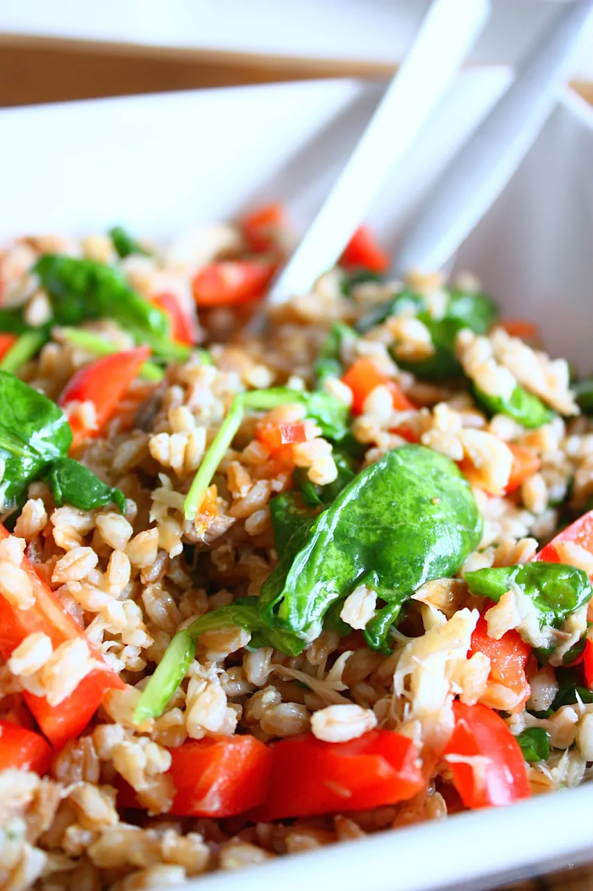 Als de farro klaar is, giet je ‘m af. Laat even 5 minuten staan met de deksel op de pan en schep daarna de spinazie en dressing erdoor. Door de warmte van de farro zal de spinazie vanzelf een beetje slinken. Schep daarna de paprika en makreel erdoor. Proef en breng eventueel nog verder op smaak met wat extra appel-ciderazijn, zout of peper.
