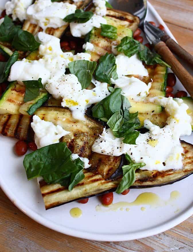 Pak een grote saladeschaal en verdeel hier de borlotti bonen over. Op de bonen verdeel je de plakken aubergine en courgette. De buffelmozzarella scheur je in stukken met je handen en die verdeel je erover samen met blaadjes basilicum. Schenk er een royale scheut olijfolie over en breng op smaak met gemalen zwarte peper.