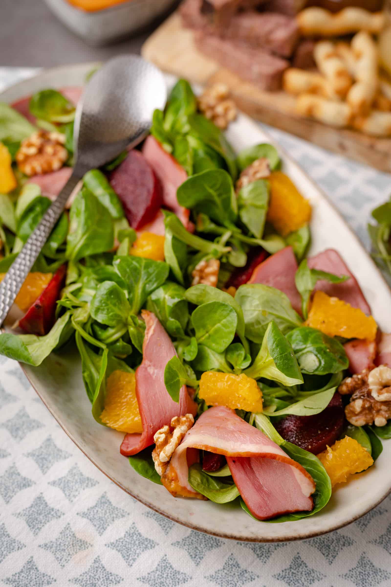 - Pak vlak voordat je aan tafel gaat een mooie schaal en verdeel hier de veldsla, partjes sinaasappel en biet over. Drapeer de plakjes eendenborst mooi over de salade heen. Besprenkel met de dressing en garneer met de walnoten.