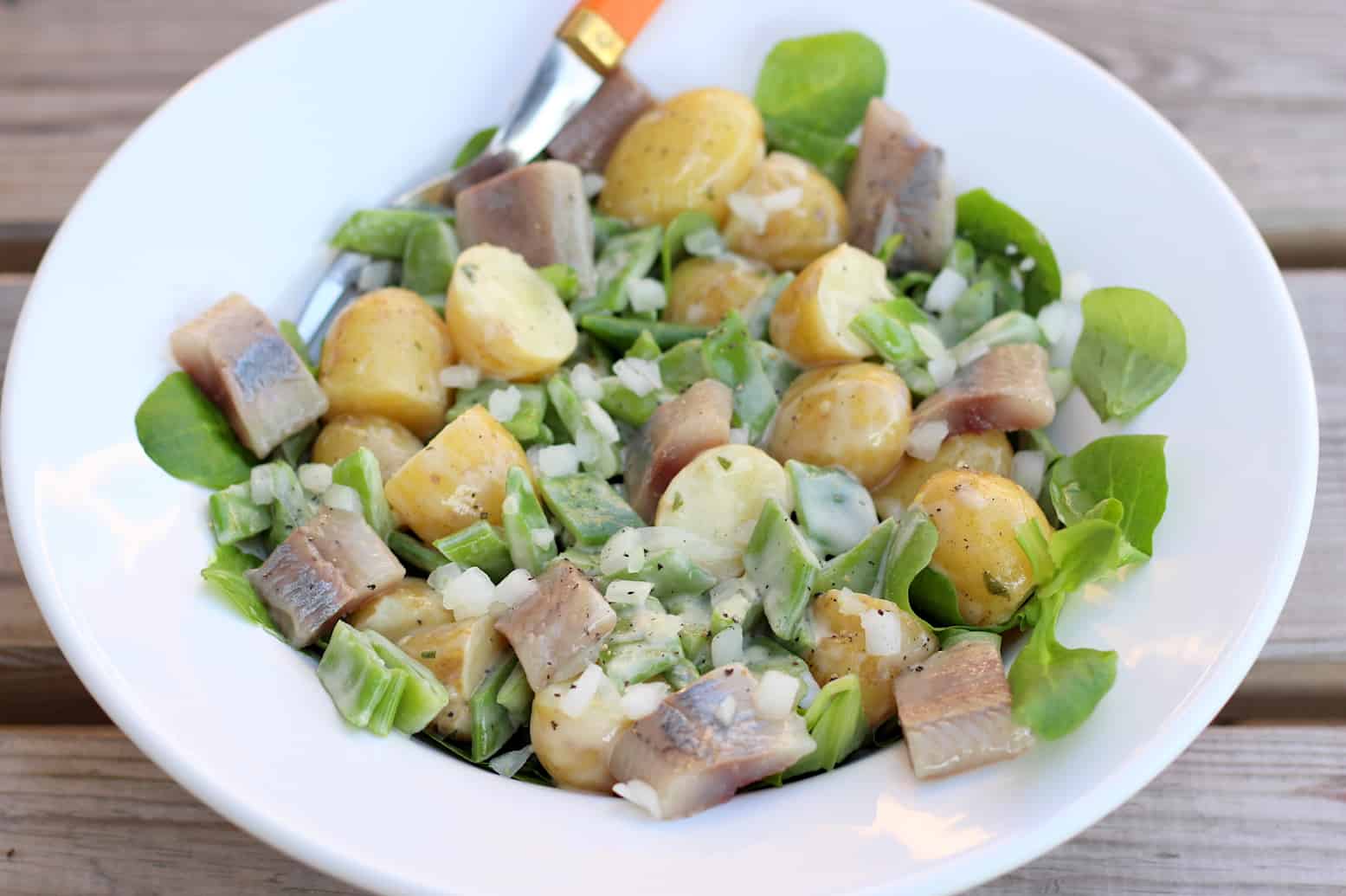 3. Meng de veldsla met de krieltjes, snijbonen, haring en gesnipperde ui in een schaal. Strooi er nog wat peper over en serveer.