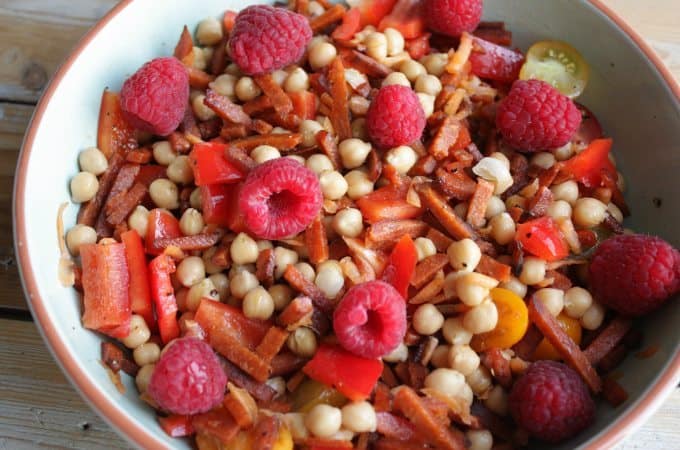 Gisteren las ik een interessante discussie over de combinatie fruit en hartig op Twitter. De moraal van het verhaal: fruit hoort niet in het eten. Geen ananas bij kip, geen abrikozen in de tajine en vooral geen rozijnen in de zuurkool. Daarom plaats ik vandaag maar een salade met frambozen, want ik ben er met vlagen dol op. Ik weet dat er onder jullie vast ook mensen zijn die niet moeten denken aan fruit in hun avondeten. Geen enkel probleem, dan sla je dit recept gewoon over. Maar voor de waaghalzen die wel durven door te lezen, heb ik een heel makkelijk en verrassend salade recept. Ontstond weer eens toen ik geen zin had om lang in de keuken te staan en er restjes in de koelkast lagen die echt op moesten. Voordat je het weet sta je op zaterdagavond opeens een salade met kikkererwten en frambozen te maken, wat een feest. Eet ‘m als lunch of lichte avondmaaltijd, beide gaat prima.