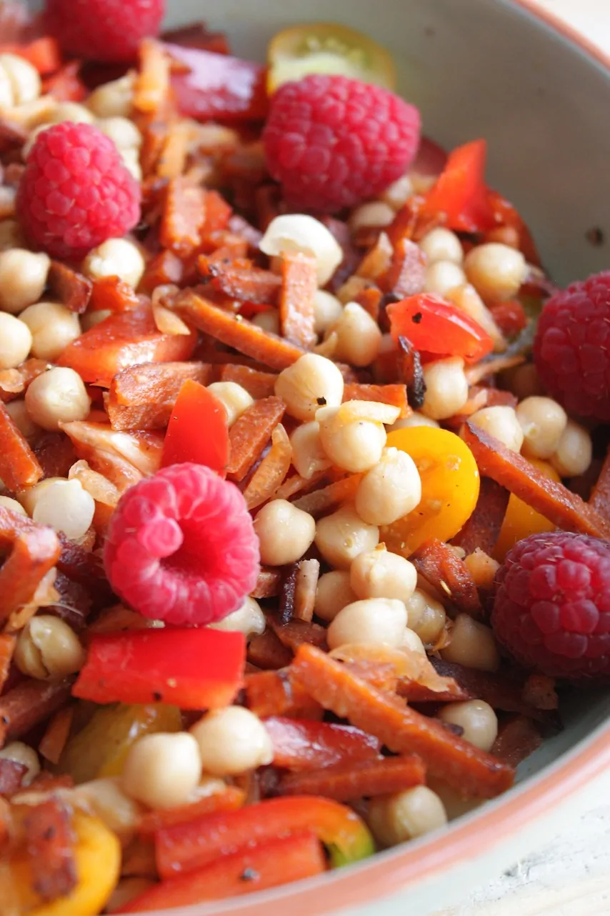 Pak een saladeschaal en meng hier de kikkererwten, gebakken speckjes of spekjes, rode paprika en cherry tomaten in samen met de vinaigrette. Garneer met de verse frambozen en serveer.