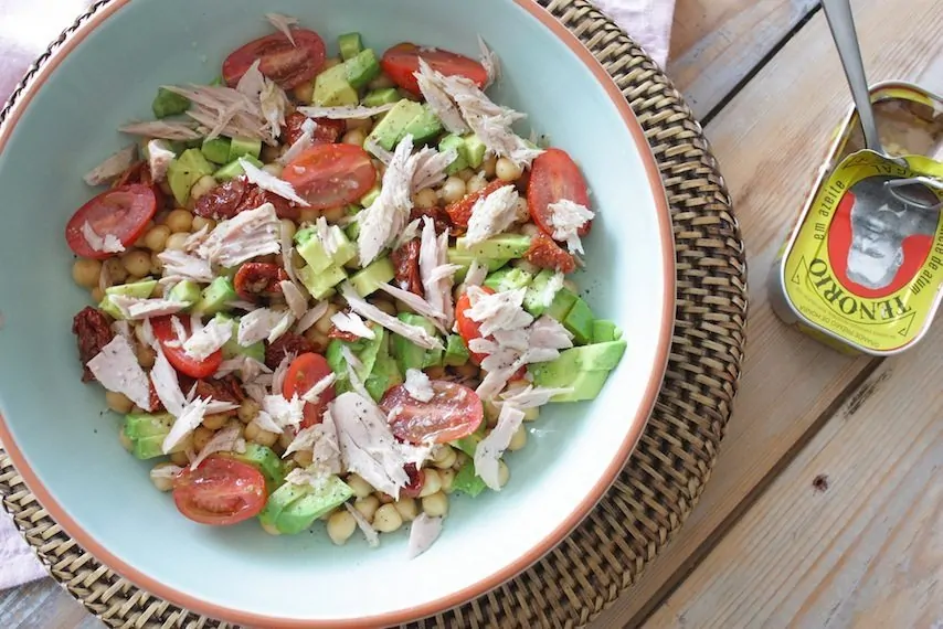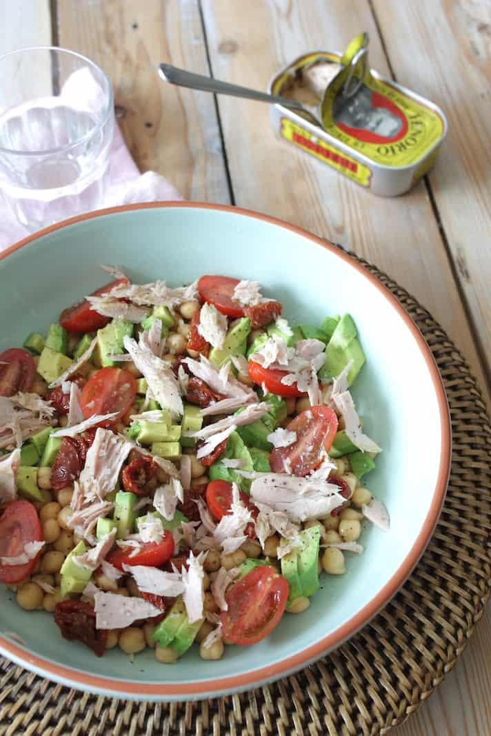 Neem een saladeschaal en meng hier de kikkererwten, avocado, cherry tomaten en gedroogde tomaten in. Haal de tonijn uit het blikje, scheur deze in stukjes en verdeel erover. Een flinke scheut olijfolie, wat zeezout en zwarte peper maken het geheel af. Eet smakelijk!