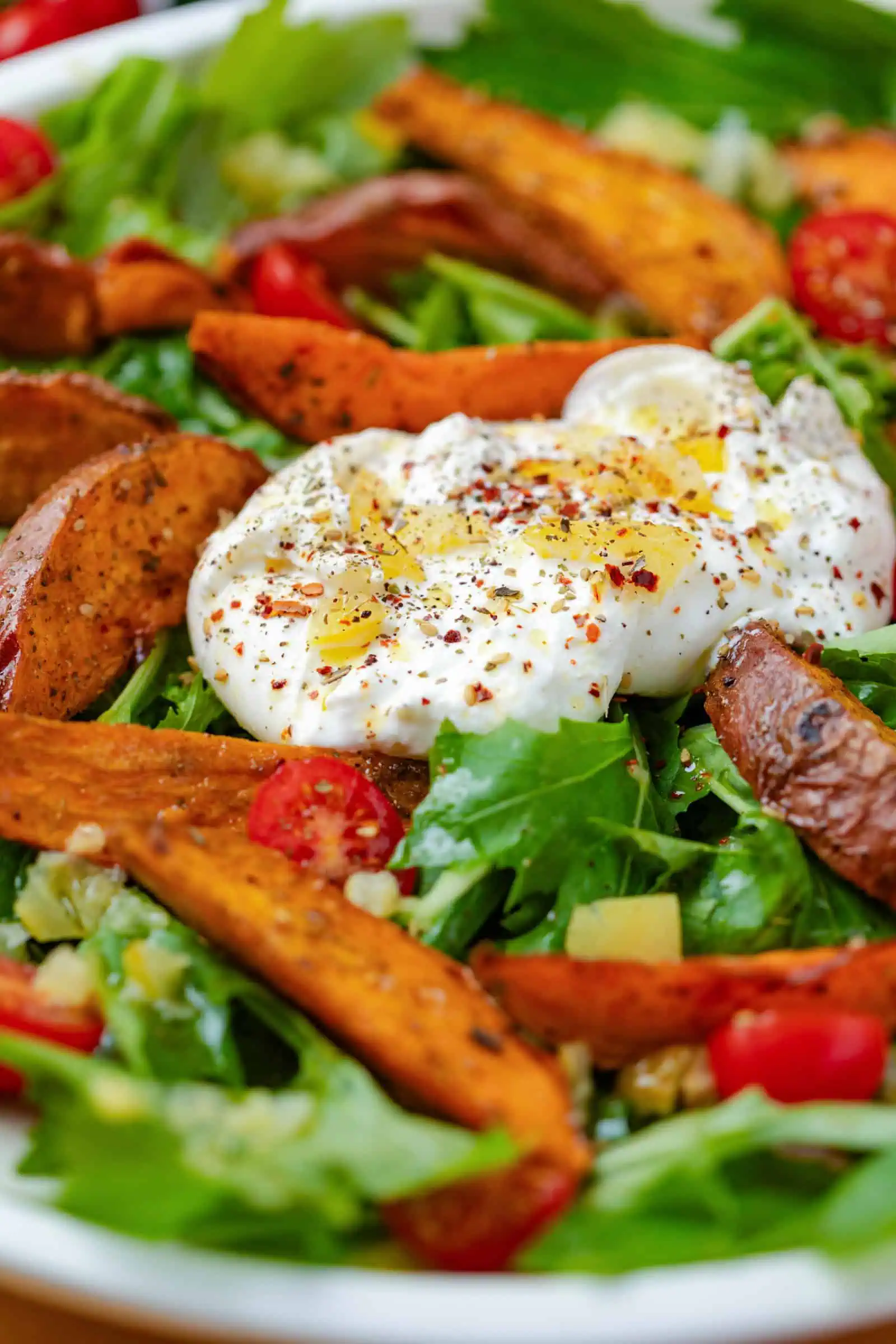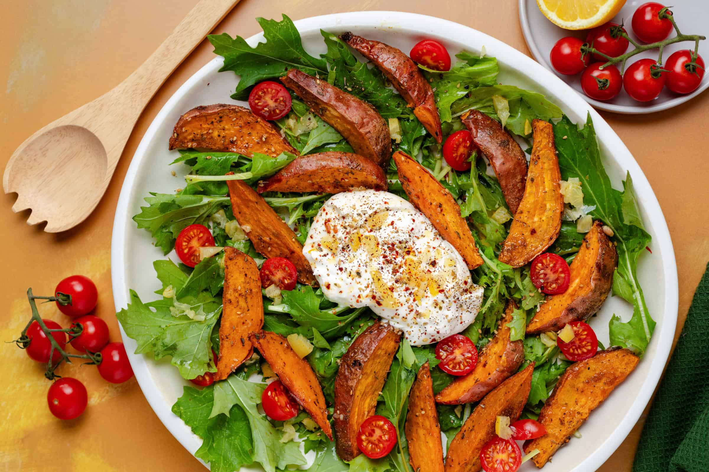 Voor deze salade rooster je de zoete aardappel eerst in de oven met specerijen en daarna komt het samen met sla, burrata, za’atar en gekonfijte citroen op een saladeschaal. Een ware smaakexplosie en heerlijk om te eten op warme dagen.