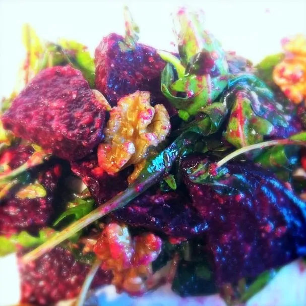 Als de rode biet klaar is, laat je deze eerst afkoelen tot lauw. Meng in een saladeschaal de rucola, rode biet, walnoten en dressing en schep goed door elkaar.