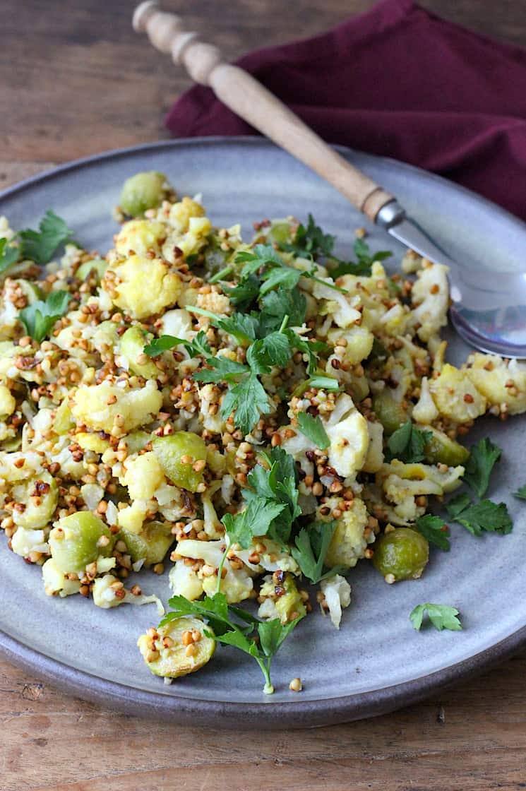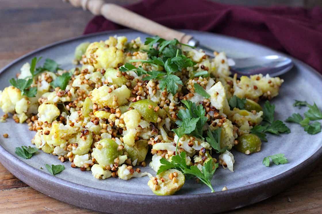 Vorige week kwam ik tot de conclusie dat er nog te weinig recepten met spruitjes hier op de blog staan. Terwijl ik er wel gek op ben. Daar mocht verandering in komen en dat is dus ook precies wat we gaan doen vandaag met deze salade van geroosterde bloemkool, spruitjes, boekweit en tahin dressing. Perfect als vegetarisch hoofdgerecht, want het vult heel goed. En eventuele restjes zijn de volgende dag ook zalig als lunch.
