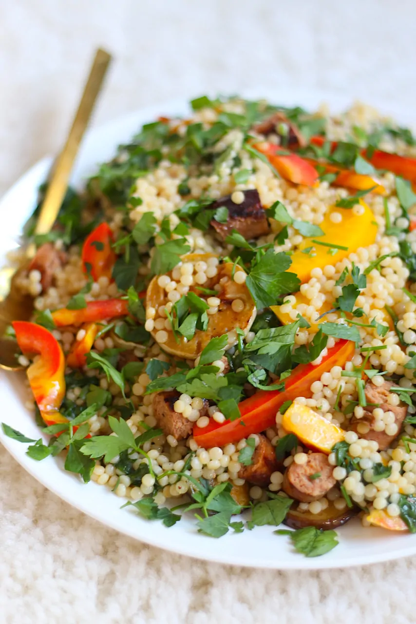 5. Meng de parelcouscous, plakjes worst en aubergine en reepjes paprika in een schaal. Maak een dressing van 4 el olijfolie, 2 el tomaatazijn, peper en zout en meng dit door de salade. Proef en breng eventueel extra op smaak. De salade wordt nog lekkerder als je ‘m even 15 minuten laat staan zodat de smaken kunnen intrekken.